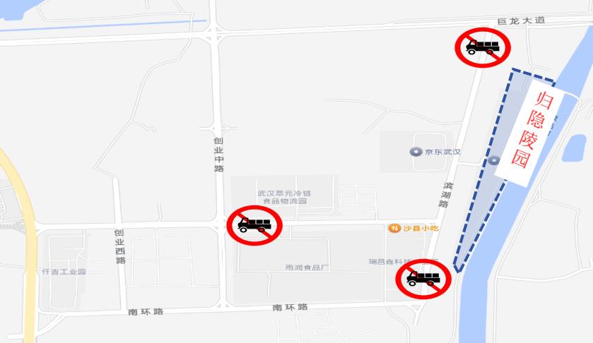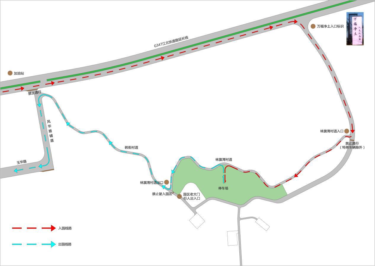清明节期间7:00-16:00,柴泊大道-347国道-林旗湾村道-万福净土陵园停车场-韩家弄村道-武汉宝龙世家旁(风华路)辅道-玉华路实行顺时针单向通行。