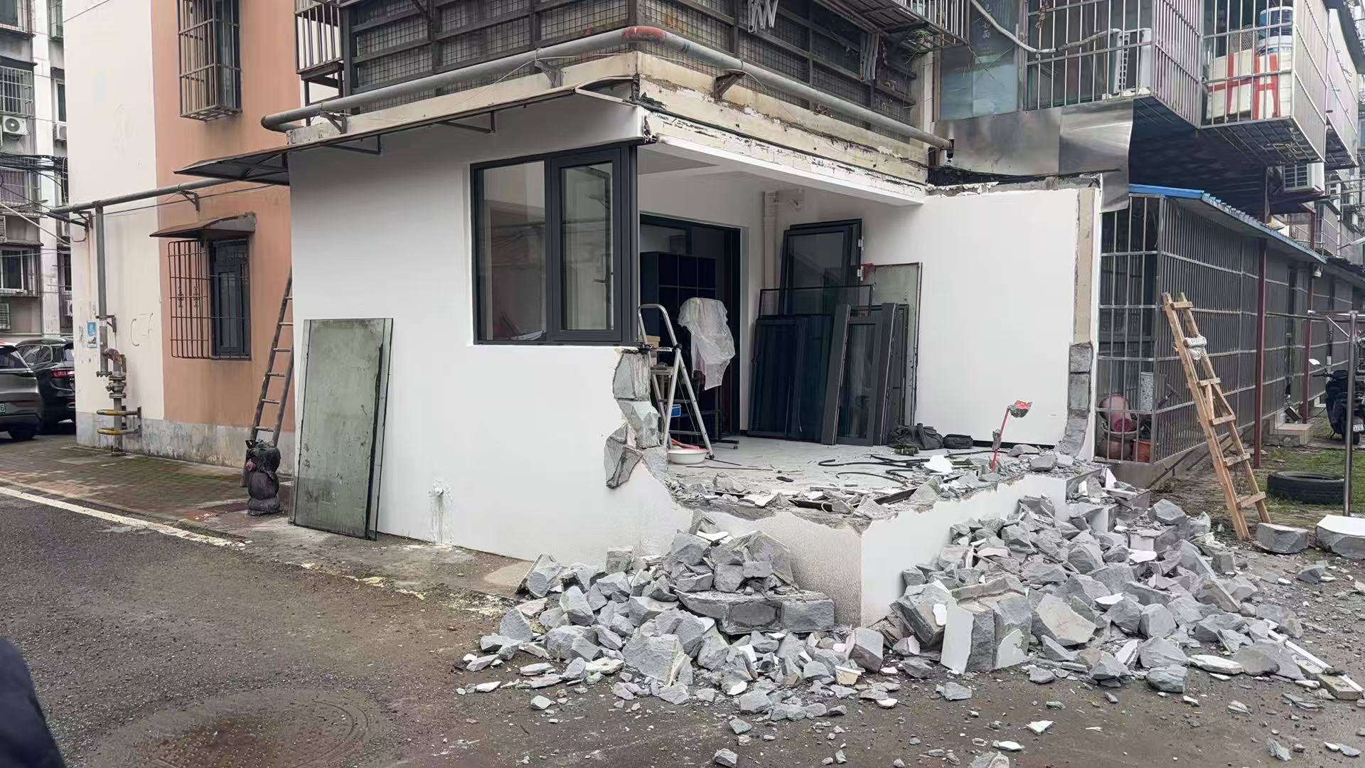 黄鹤楼街道综合执法人员介绍,前期摸排发现两处违建,一处为生物宿舍一业主擅自搭建的玻璃阳光房,该违规外扩阳台不仅侵占公共空间、破坏楼栋外立面整体风貌,更存在结构安全隐患。另一处是某旅馆院内的复建违法建设,该建筑此前已于2024年被依法拆除,如今该旅馆在原址上重新搭建了40平方米违法建筑,严重侵占了公共空间,对周边居民日常生活造成不利影响。