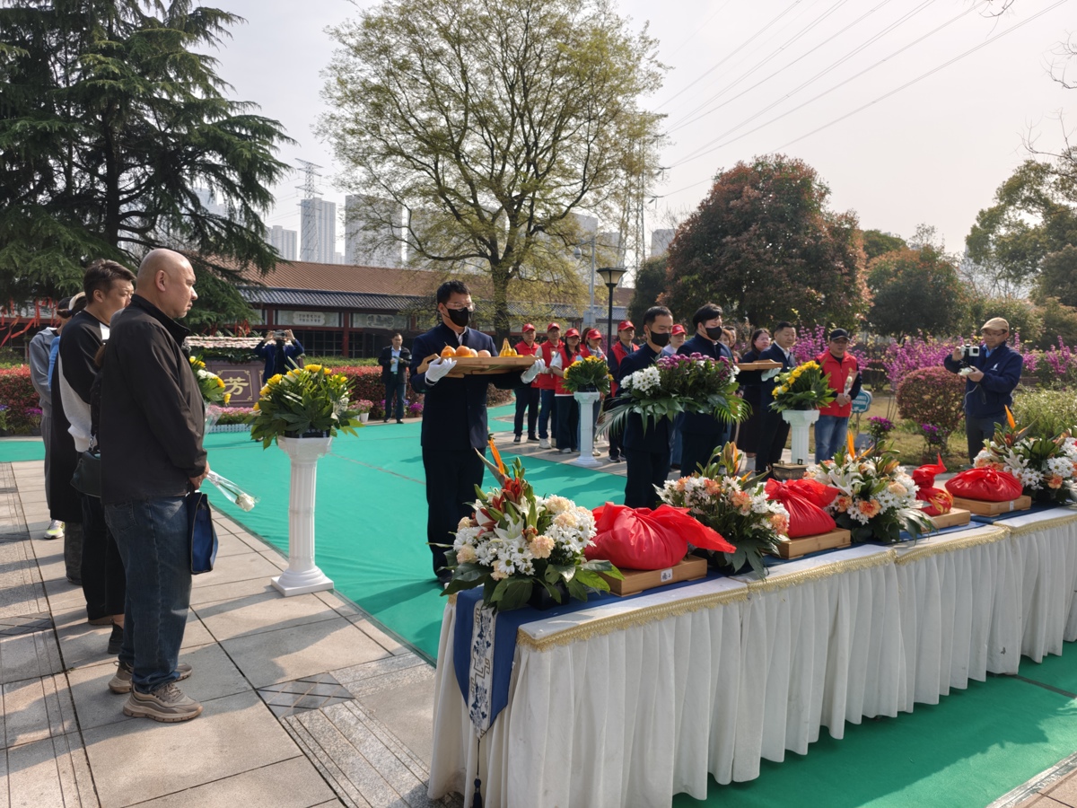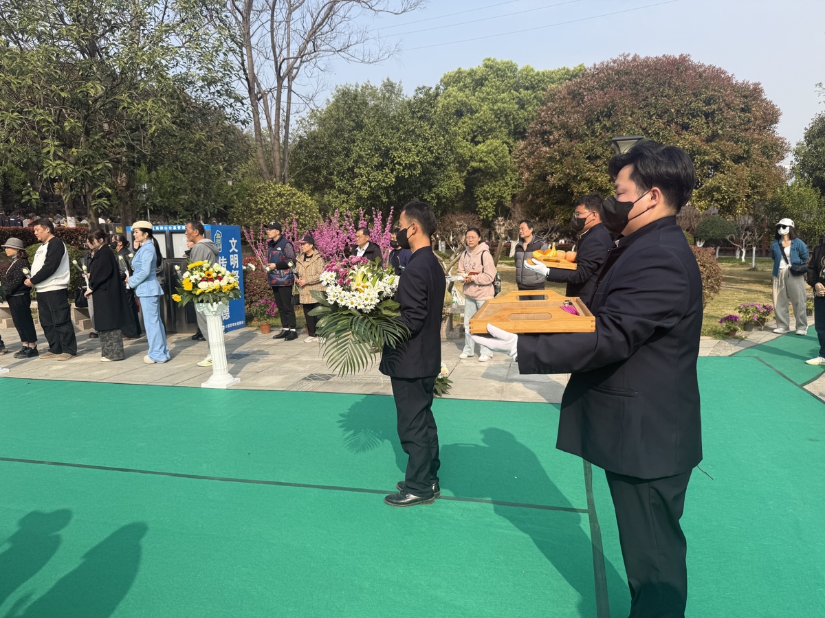 仪式现场静谧而肃穆,青松环绕、微风轻拂,没有烦琐的流程,没有厚重的祭品,唯有淡淡的花香和满心的敬意。仪式通过骨灰供奉、灵骨安放、献花寄思等环节有序推进,礼仪人员动作轻柔,每一个细节都饱含对逝者的缅怀;参与人员手持洁白的玫瑰,依次走到安葬区域,弯腰放下花束,用“鲜花寄哀思”的文明方式,寄托对逝者的思念,彻底摒弃了传统祭祀的烦琐与厚重,彰显着绿色、简约的殡葬新风。