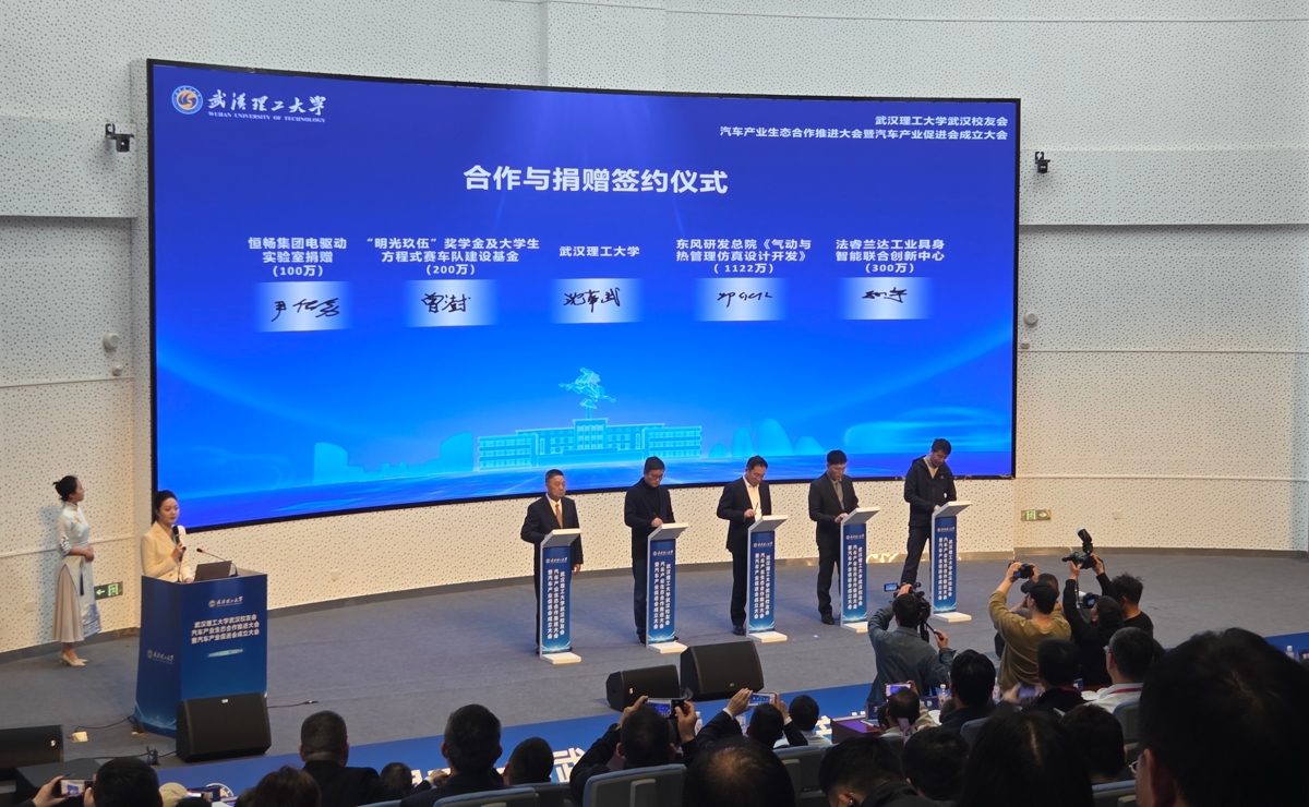 3月28日下午,武汉理工大学军山校区学术交流中心内,一场聚焦汽车产业生态合作的盛会如期举行。“凝聚校友力量、深化产教融合、共筑汽车产业新生态”,在此次武汉理工大学武汉校友会汽车产业生态合作推进大会暨汽车产业促进会成立大会上,武汉理工大学汽车产业促进会正式揭牌成立,同期举行的招才招商大使聘任、校企合作项目签约及捐赠仪式,标志着校地校友三方协同迈入组织化、平台化新阶段,为武汉经开区汽车产业高质量发展注入强劲动能。