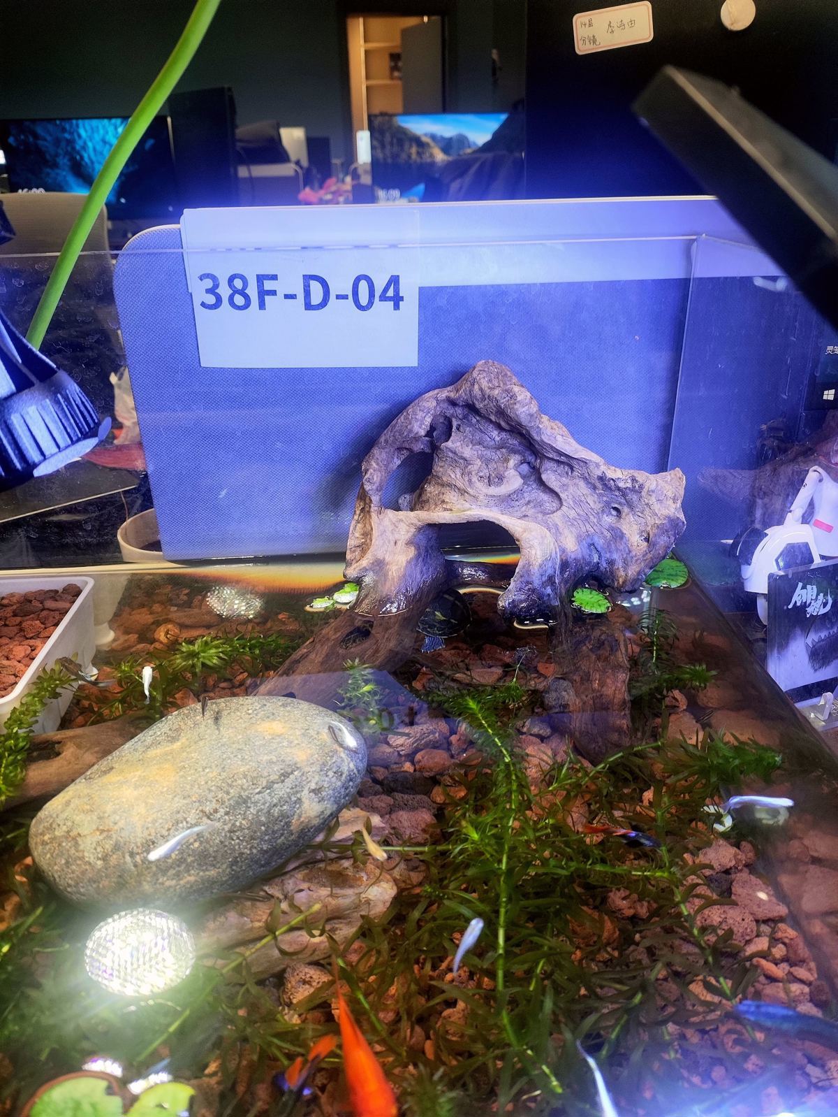 这里说的摸鱼,是真的物理意义上的摸鱼。记者在一处工位上看到,一个透明水缸里,一群五颜六色的鱼儿游来游去,一只小乌龟把身子藏在景观石后面。一位男设计师是它们的主人,他说,每天换换水、喂喂食、眼睛发酸时瞅几眼,效果跟吸猫撸狗的作用一样。