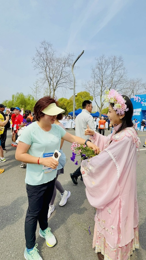 不少选手在接过鲜花时感叹“太幸福了”,还有人主动跑过来找他们拿花、合影,想要带一份“春天的味道”回家。赛道沿线,志愿者们也不断为跑者加油鼓劲,一朵朵鲜花伴随着“加油”的呐喊声,成为赛道旁最温暖的风景。