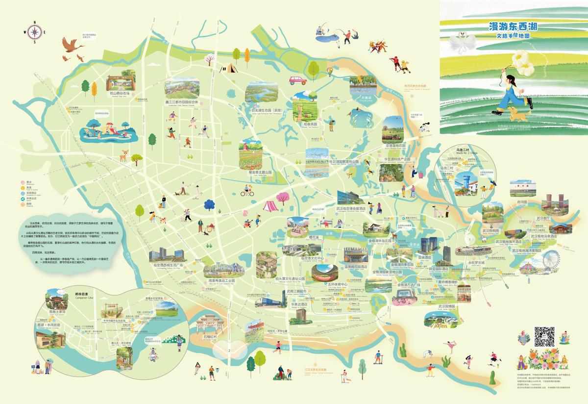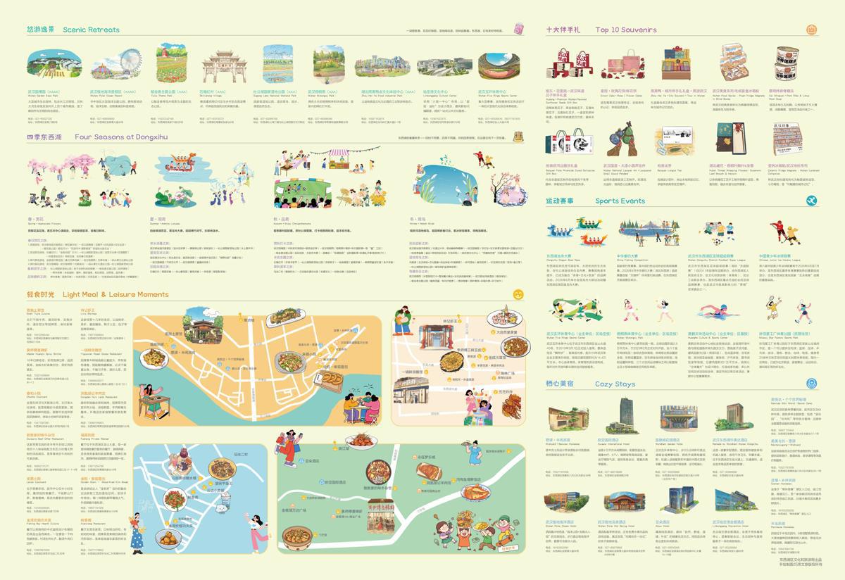 每一位参赛选手在领取参赛包时,都惊喜地发现里面附赠了一份精美的“漫游东西湖”文旅手绘地图。这份地图不仅标注了东西湖四季好去处,更将全区好吃、好玩、好逛的景点一站式呈现——马池二村、梧桐雨、极地海洋度假区、杜公湖国家湿地公园、金银湖国家湿地公园、码头潭文化遗址公园、巨龙湖生态园、柏泉茶园、天鹅湖、空港湿地花田、鑫三江都市田园综合体、郷伴慈惠、五环体育中心……一幅地图在手,东西湖的精彩尽在掌握。