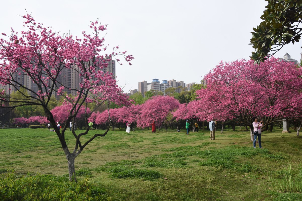 阳光大草坪上,粉红花海与鲜绿草地相映成趣,以远处的城市楼宇为背景,勾勒出“城在园中、园在景中”的诗意景致。漫步花间,花香萦绕,目之所及皆是浪漫,市民们或驻足拍照,定格春日美好;或闲坐草坪,享受暖阳与花香;或携家人漫步,沉浸式感受春日生机,每一幕都满是治愈与欢喜。