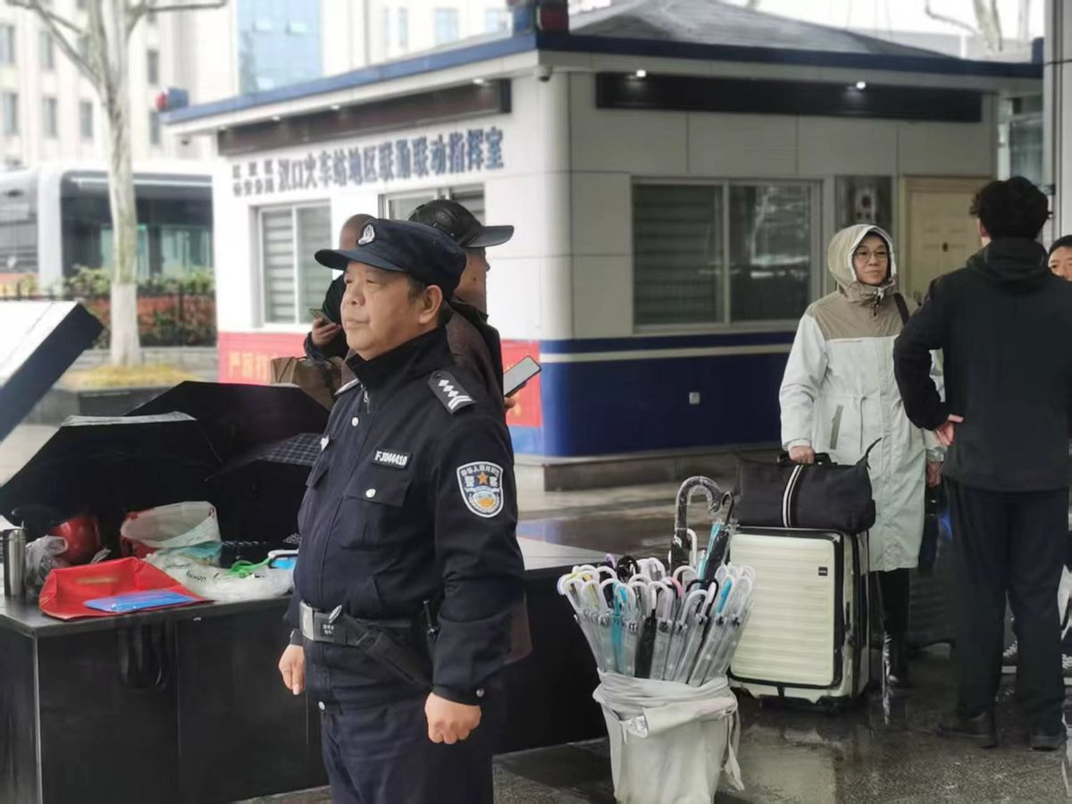 如今即将退休的他,每天仍旧准时出现在广场,成了汉口火车站一个特殊的平安印记。
