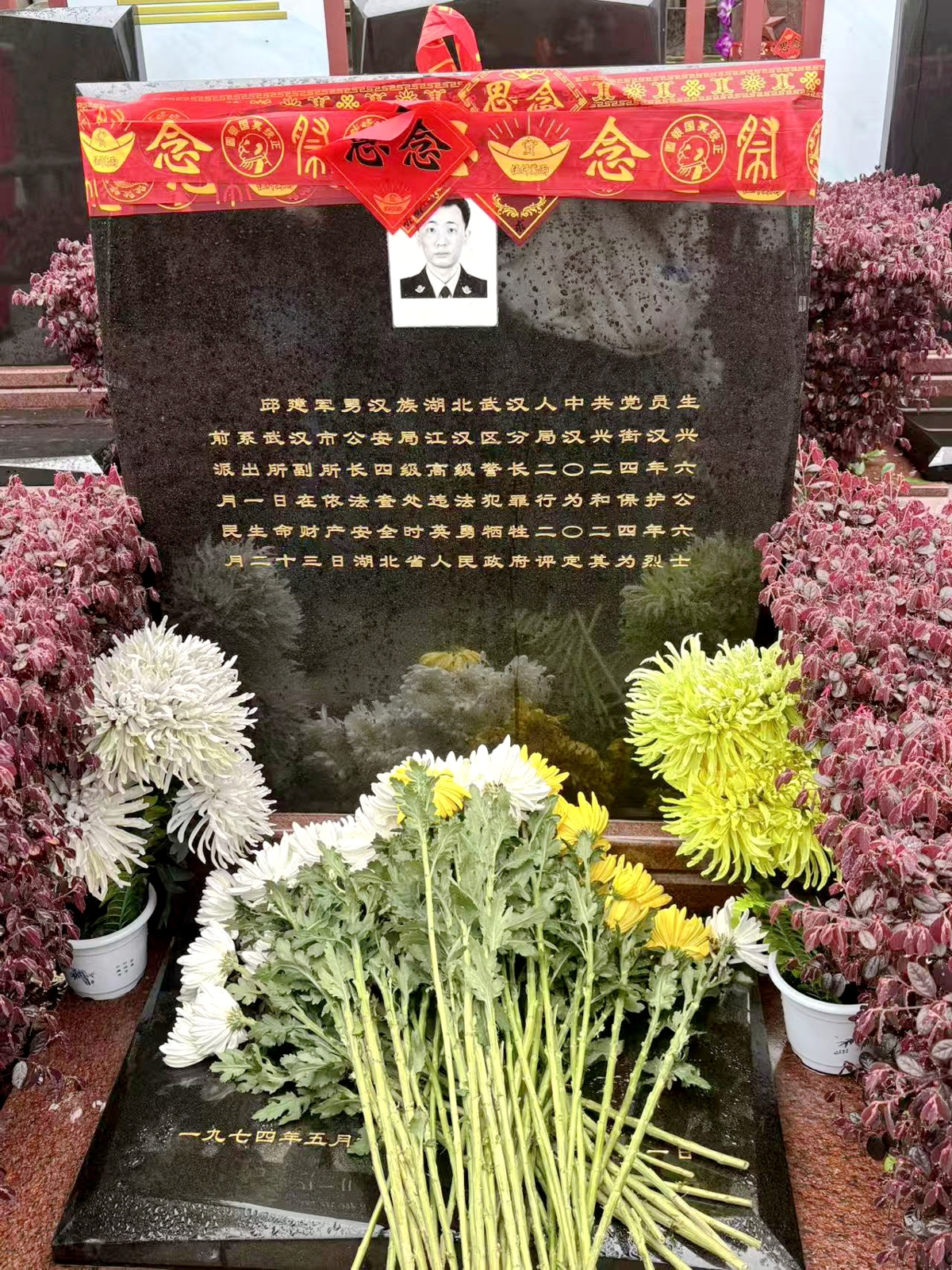 随后,大家来到邱建军烈士的墓前,手捧金黄的菊花,逐一向烈士鞠躬,表达对他的无限崇敬和思念。