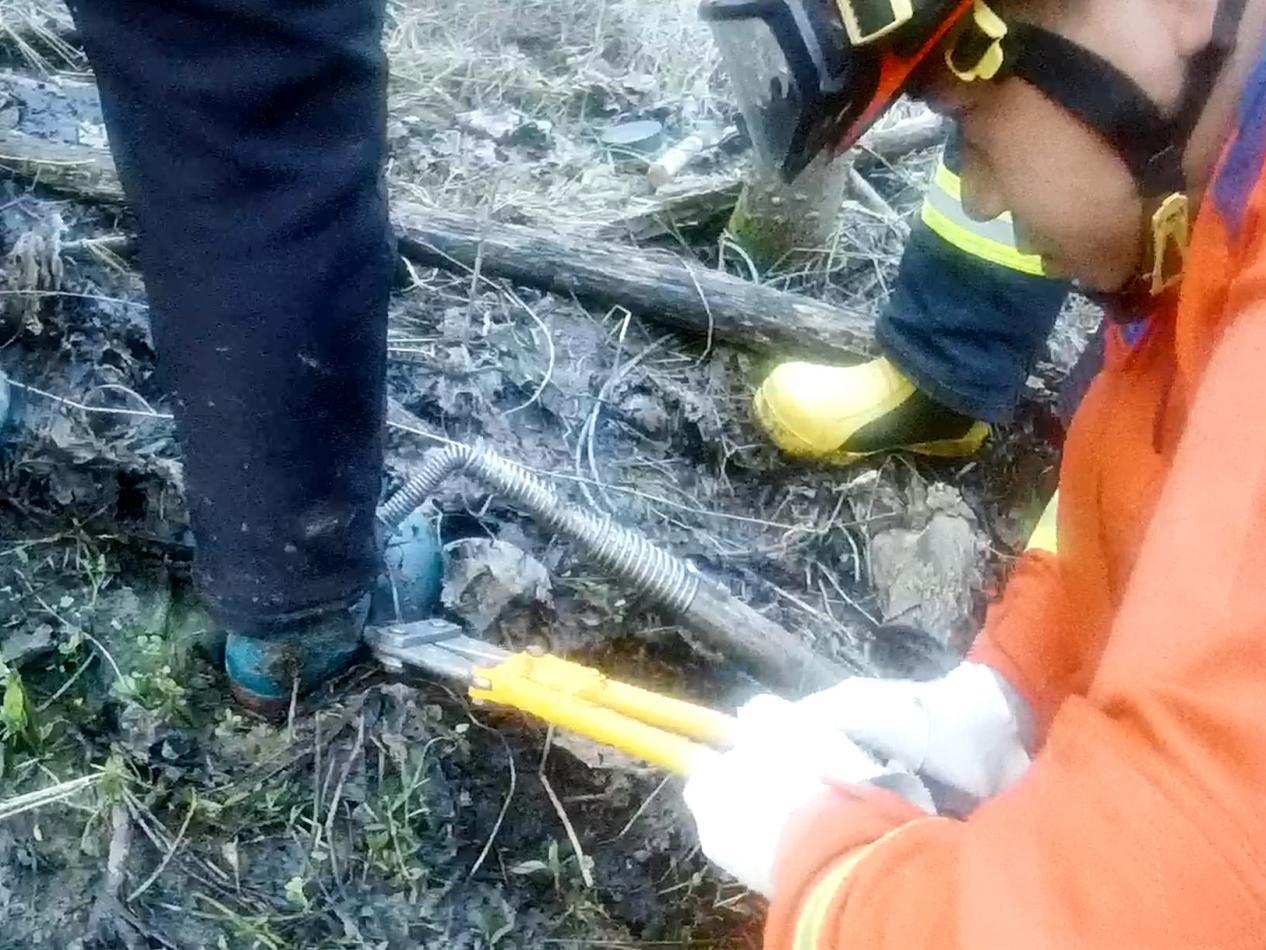 为确保安全,救援人员首先对周边荒林进行了全面清理,排除了其他安全隐患。随后,消防员立即分工展开救援:一人负责搀扶老人并稳定情绪;另一人蹲身护住老人右脚,严防操作过程中造成二次伤害;第三名消防员则手持液压剪切钳,对准捕兽夹进行精准破拆。