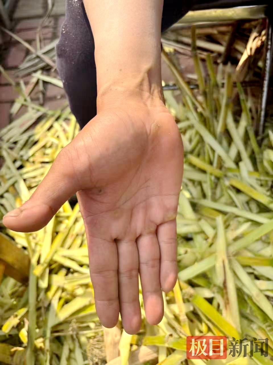 “实在太忙了,一上午连喝水的时间都没有,根本记不清到底卖了多少根。”吴先生抽空停下手中的削皮动作,摊开自己的手掌,掌心和指尖赫然布满了通红的水泡,有的已经磨得发亮,看着让人心疼。“昨天生意就特别好,一天卖了100多根,晚上收摊回家,胳膊和手都累得抬不起来。”
