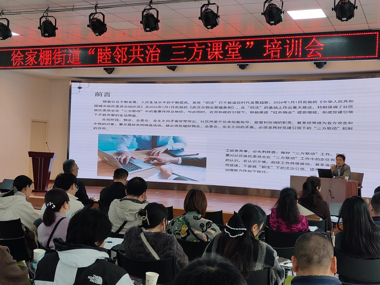 3月31日,武昌区徐家棚街道“睦邻共治 三方课堂”培训会在喻家湖社区开讲,培训紧扣基层治理难点,围绕“红色物业”建设与基层治理创新,聚焦治理效能提升、诉求渠道拓宽、信息沟通破解三大核心议题,共商共治良策,为徐家棚街道基层治理现代化注入新动能。