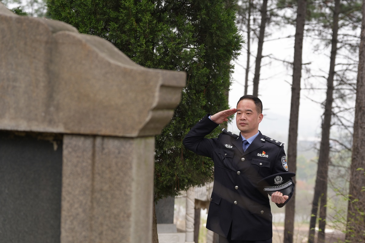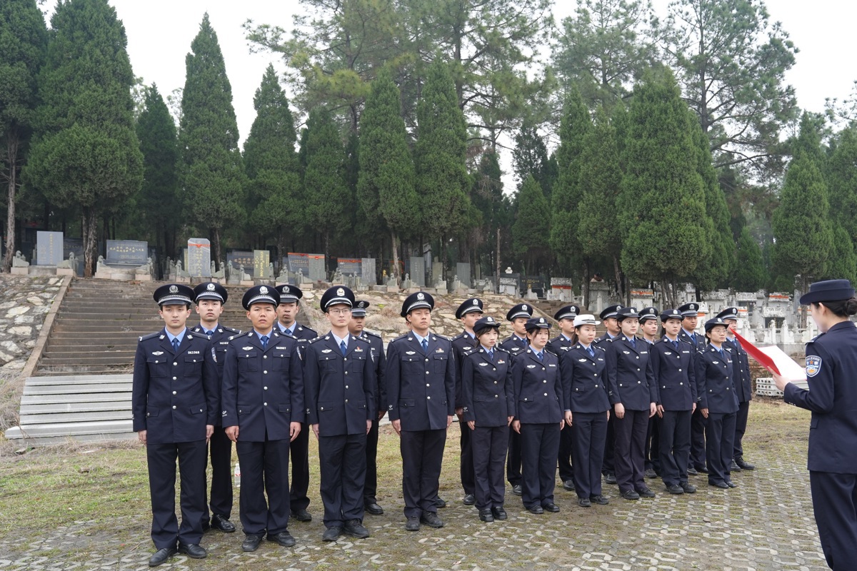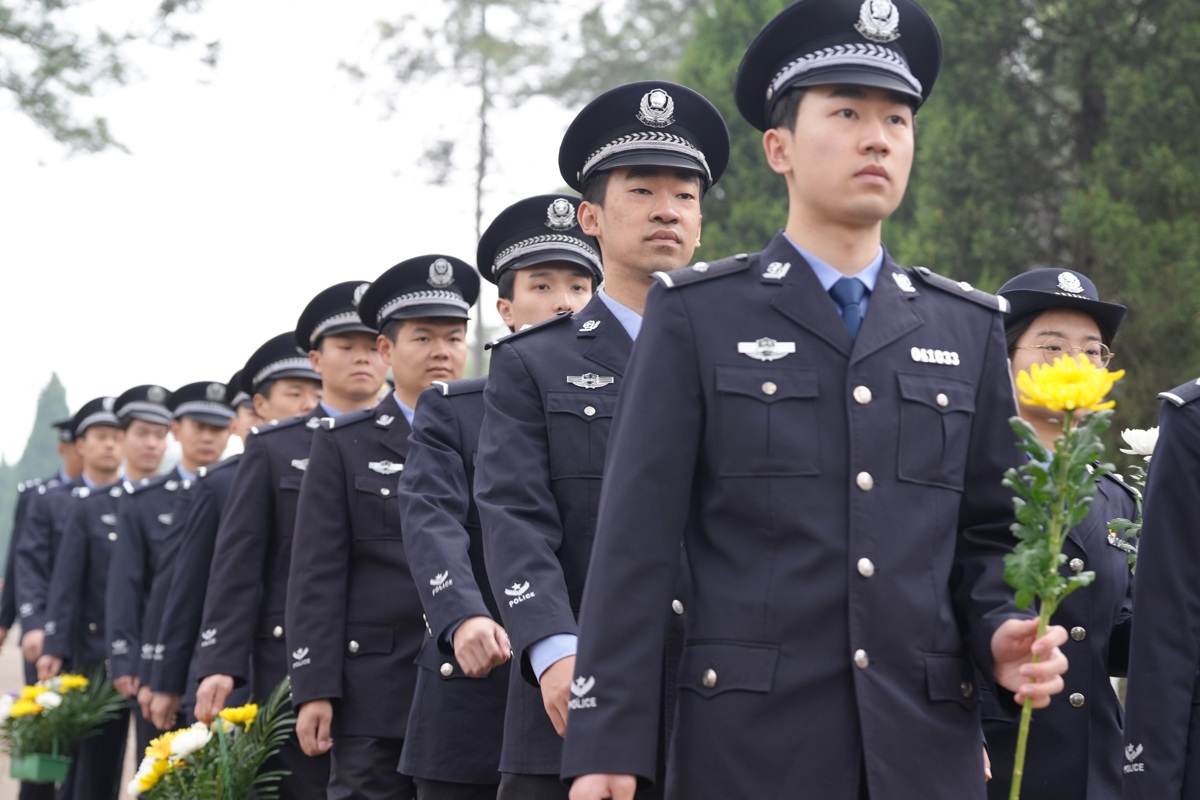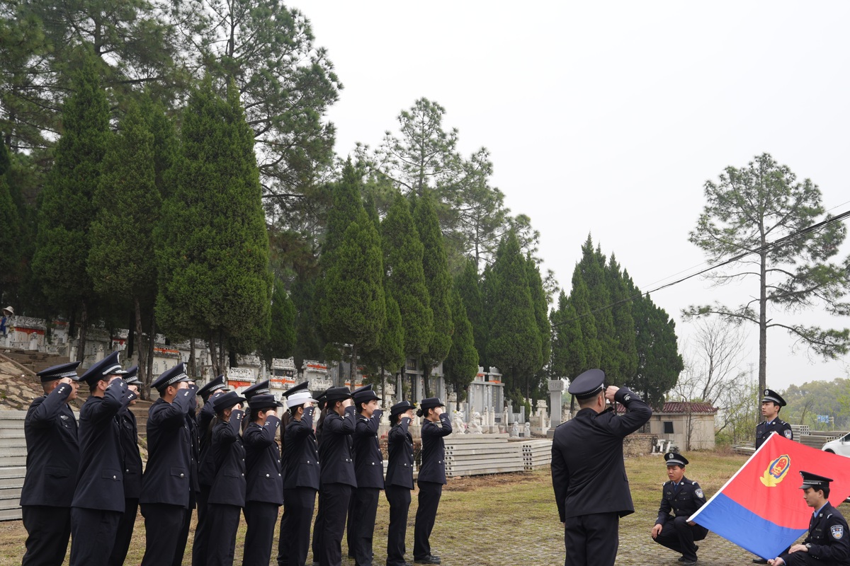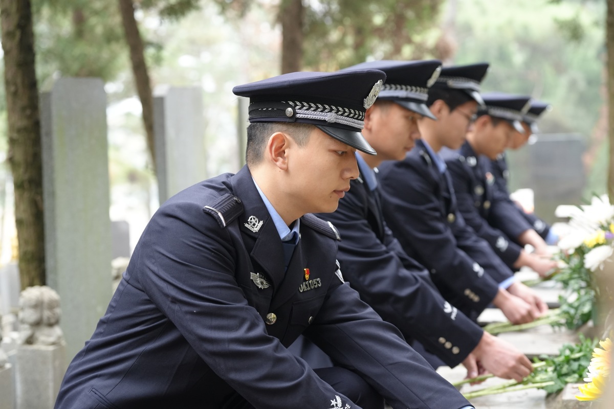 松柏青翠,草木含悲。在黄陂区前川街西陵山公墓,23名青年民警身着警服,脱帽肃立,向公安英烈敬礼默哀。默哀毕,青年民警们依次向程超坤、冯长城、胡礼贵、张富宗、李荣、吴志军等6位英烈的墓碑敬献花篮。