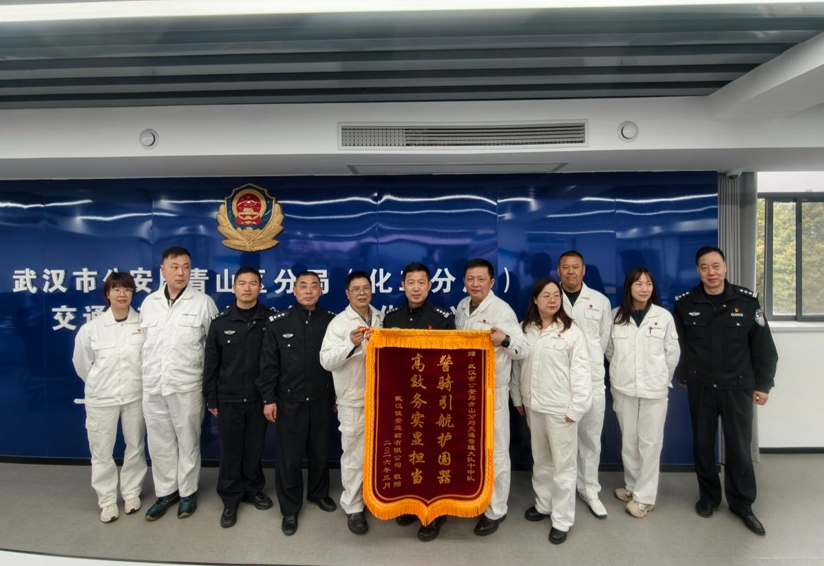 3月31日上午,武汉佳安运输有限公司负责人一行专程来到青山区交通管理大队,向大队赠送锦旗,以表达对大队民警长期以来全力保障大件运输安全畅通的衷心感谢。