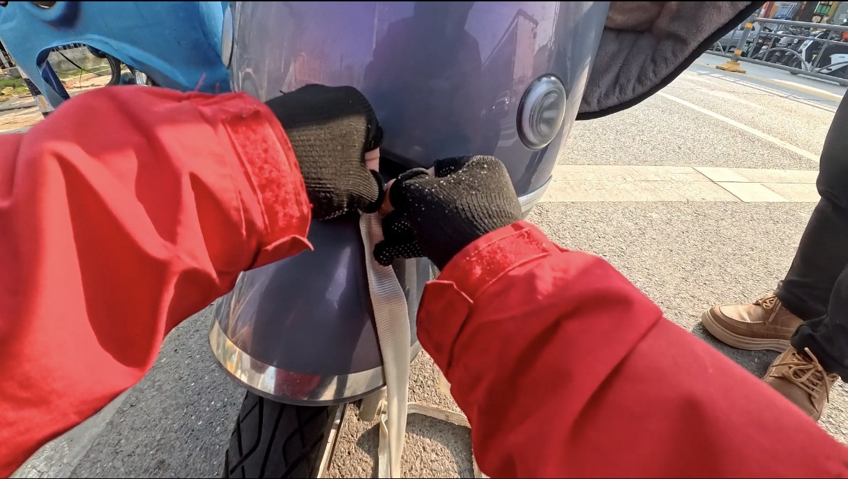 焦浩立刻停下送餐车问询原因,在征得对方同意后,他迅速从送餐车后备箱里拿出一段约5米长的牵引绳,熟练地将绳子绑在对方电动车的车龙头上,再系牵到自己的车尾。随后,他耐心地叮嘱对方在经过红绿灯时要保持安全车距。