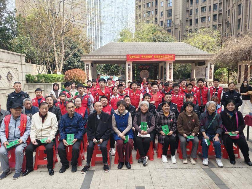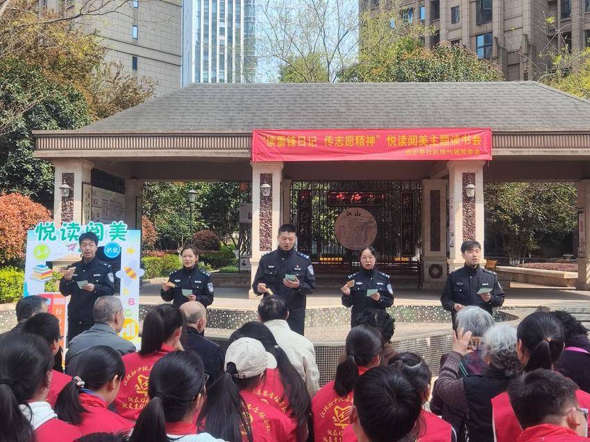 3月27日下午,江岸区百步亭现代城四区里传出了琅琅读书声和清脆的快板声。一场以“读雷锋日记,传志愿精神”为主题的悦读悦美共读活动正在这里举行。武汉市公安局江岸区分局百步亭派出所的民警们和辖区居民志愿者、武汉市燃气事业发展中心、国家电网百步亭服务站、辖区汉铁初中师生及家长等多方力量齐聚一堂,大家你一言我一语,共同把学雷锋志愿服务月的氛围拉满。