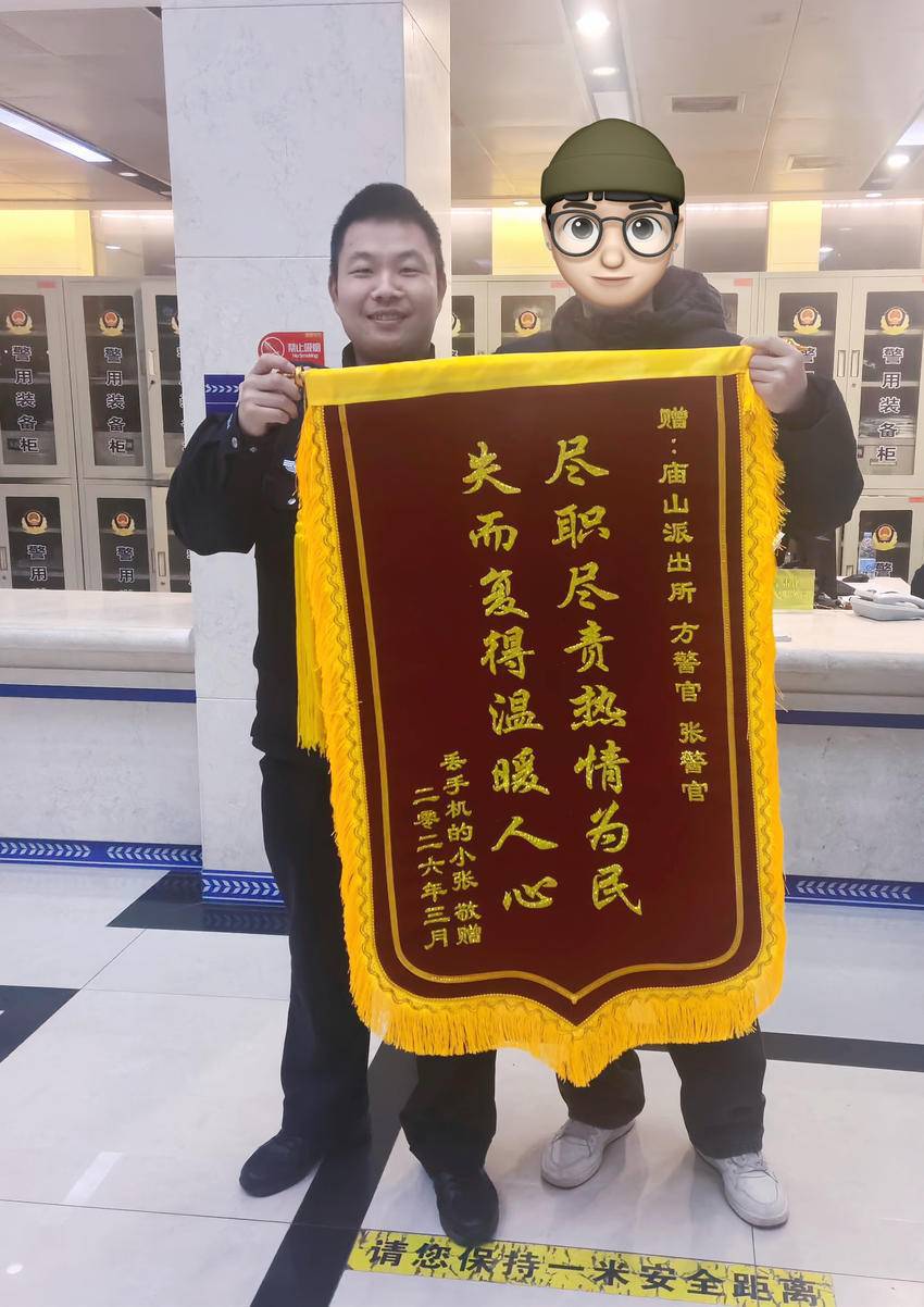 “手机丢了,里面的资料很重要。”3月12日,群众张先生焦急地跑进庙山派出所。值班民警方泽民、视频文员张力维二话不说,一头扎进监控室。画面一帧帧回放,线索一点点浮现。手机在庙山大道一酒店前掉落,被后面一个骑电动车的人捡走。研判、比对、联系……仅用1小时,手机原封不动送到张先生手中。张先生事后专门给方泽民送来锦旗以示感谢。