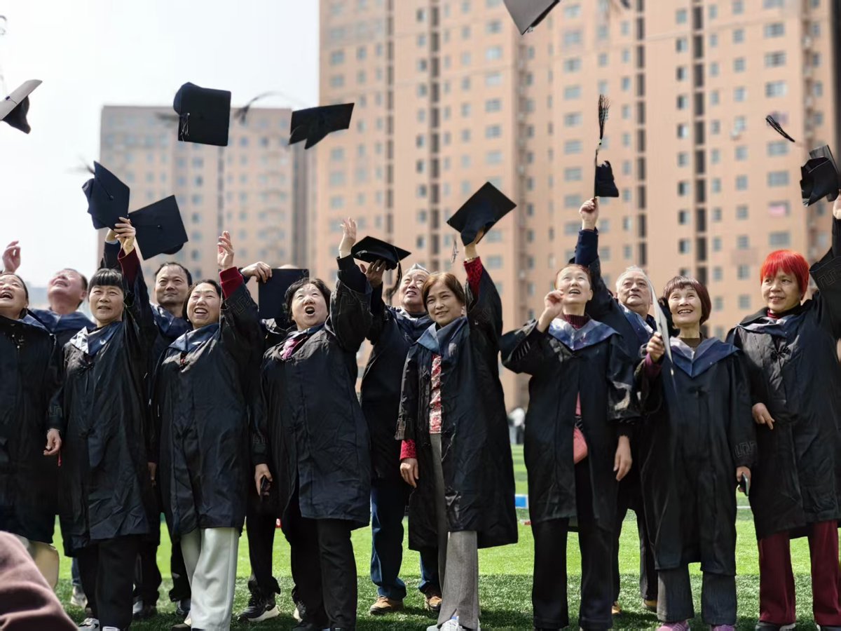 活动最后,一场特别的“银发毕业典礼”在操场前举行。长者们穿上学士服,在镜头前留下属于自己的“毕业照”。一位老人戴上学士帽后,激动得像个孩子:“这辈子没上过大学,今天终于圆了大学梦!”