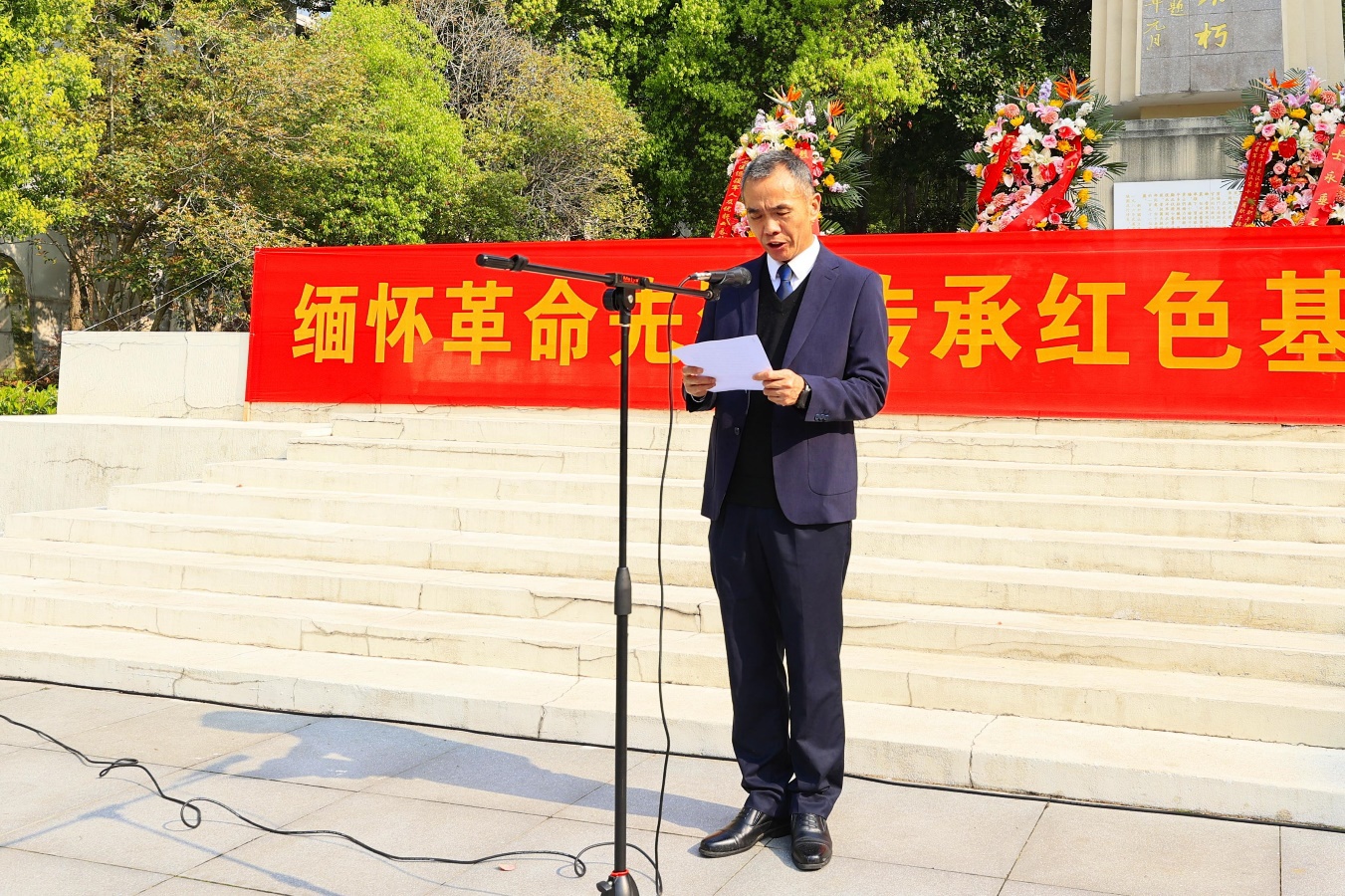 在工作人员引导下,全体代表依次有序上前,向革命先烈敬献鲜花。一朵朵金黄与素白的鲜花,承载着追思与敬意,寄托着对英烈的深切缅怀。