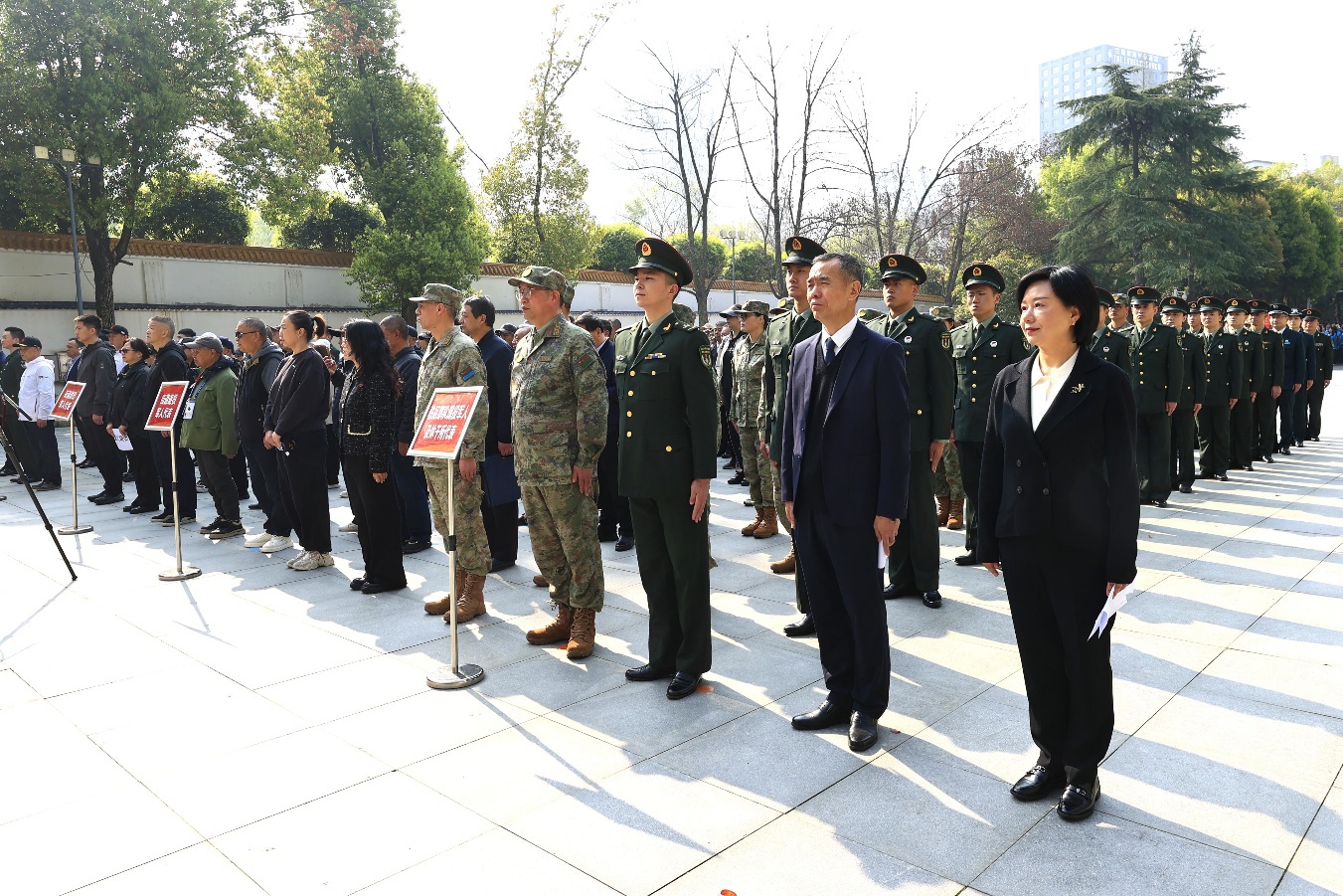 活动现场,庄严肃穆,纪念碑高耸入云,鲜花寄托哀思。驻区部队官兵、军休干部及优秀退役军人代表整齐列队,军容严整,共同致敬英烈。
