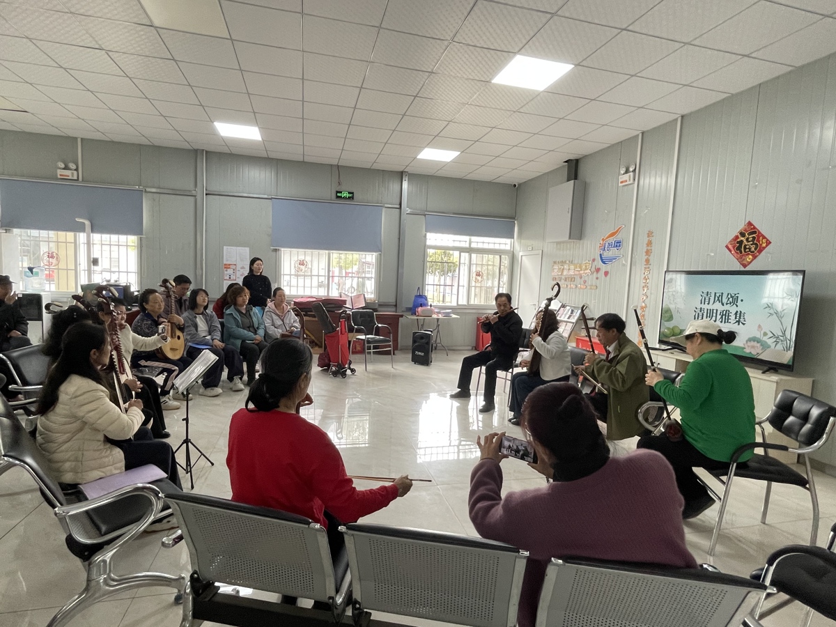 活动以器乐合奏《洪湖水浪打浪》开场,二胡、琵琶、阮、笛子等乐器共同演绎经典旋律。现场设置了趣味知识问答环节,内容围绕“两袖清风”典故、清明民俗、红歌接龙等展开,居民踊跃参与互动。