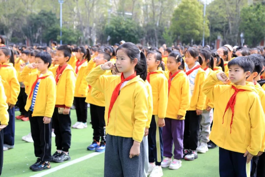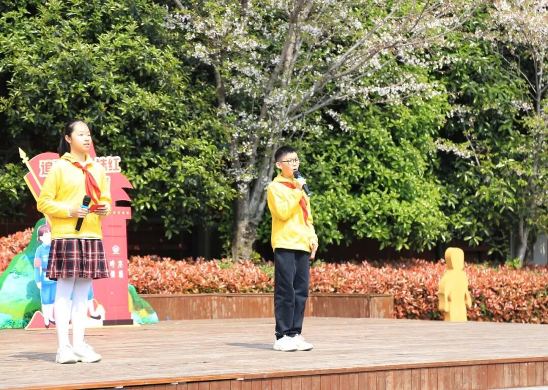 “每人读一本好书、每人做一件好事、每人讲一个故事。”该校少先队副大队长向全校同学发出“红色领读人行动”倡议。10名红色领读人带来诗朗诵《雷锋日记里的光》。宣誓环节,全场师生的誓言在校园里回荡。