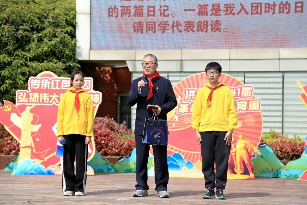 区关工委副主任、区“五老”报告团、银发正能量宣讲团团长周承先作为特邀嘉宾,展示了54年前和52年前在部队写下的入团日记、入党日记,用朴实的语言向孩子们讲述自己的青春军旅岁月与入党初心。他还向少先队员代表赠送了红色纪念册。孩子们回赠了自己准备的礼物,一老一小,在台上完成了一次无声的交接。