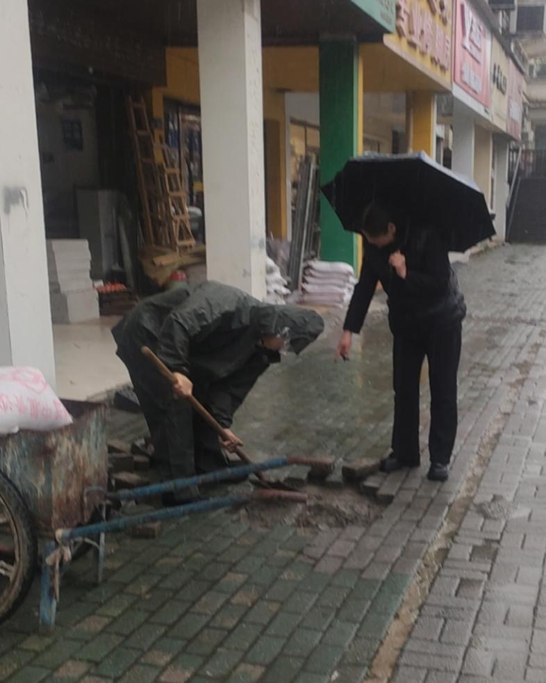 近日,网格员在日常巡查时发现,辖区一门面地面坑洼凹陷,行人通行存在安全隐患,当即告知物业。物业工作人员第一时间赶到现场,迅速纳入维修计划。维修当天恰逢下雨,路面湿滑,给施工增加了难度。物业施工队鲁师傅扛着铁锹、拎着水泥砂石冒雨赶到现场,蹲在地上仔细清理坑内碎石、泥土和积水,找平凹陷处后,一勺一勺铺上水泥砂浆,反复压实,确保路面平整牢固。
