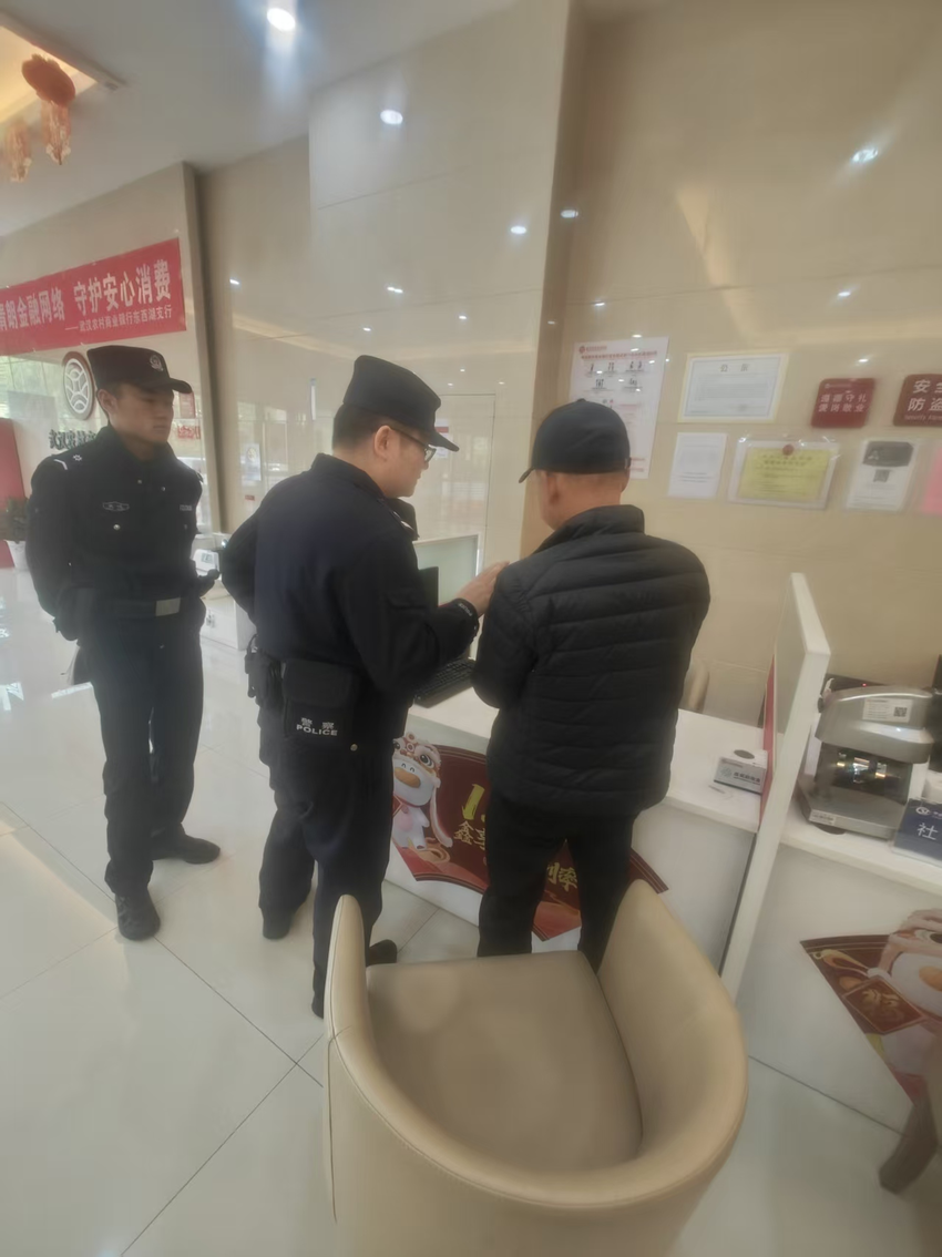 “异常转账,请民警到场核实。”当日12时许,武汉市公安局东西湖区分局径河街三店派出所接到辖区某银行部门的预警信息,居民王先生疑似遭遇电信诈骗。民警冯文涛火速带领辅警宋一波、张浩,驱车赶到现场,向当事人了解情况。