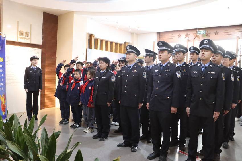 “坚决拥护中国共产党的绝对领导,矢志献身崇高的人民公安事业……”参观结束后,全体民警辅警在纪念馆入口整齐列队,高举右拳,重温誓词。恰逢此时,前来参观的东湖路小学师生见证这庄严一幕,他们齐刷刷地举起右手,致以庄严的少先队礼。