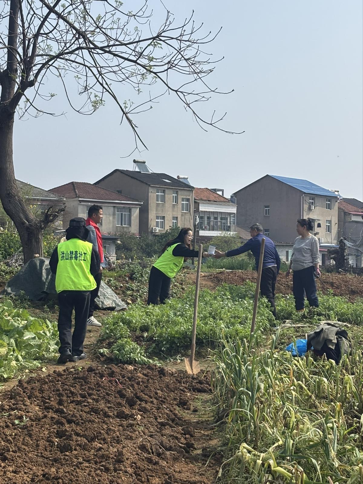 4月1日,武汉市洪山区洪山街道禁毒社工联合汤逊湖辖区民警、社区工作人员共同参与禁种铲毒活动。工作人员以“不漏一户、不放过一株、不留一块死角”为原则,对辖区内的田间菜地、房前屋后、闲置空地等重点区域进行拉网式排查。