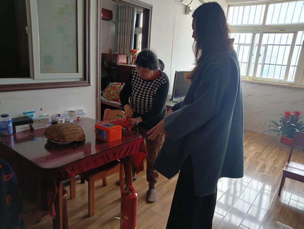 当日下午,西城壕社区由网格员、志愿者及物业工作人员组成多个走访小组,逐一走进都景园、金厦银座两座高层住宅内的独居老人及残疾人家庭。每到一户,社区工作者都耐心细致地向居民讲解近期高层建筑火灾的典型案例,强调高层住宅防火的重要性与紧迫性。针对老年人及行动不便人员自救能力相对较弱的特点,工作人员现场为他们安装并演示独立式烟感报警器、干粉灭火器、防火毯“三件套”的使用方法,确保居民在紧急情况下能够会操作、用得上。