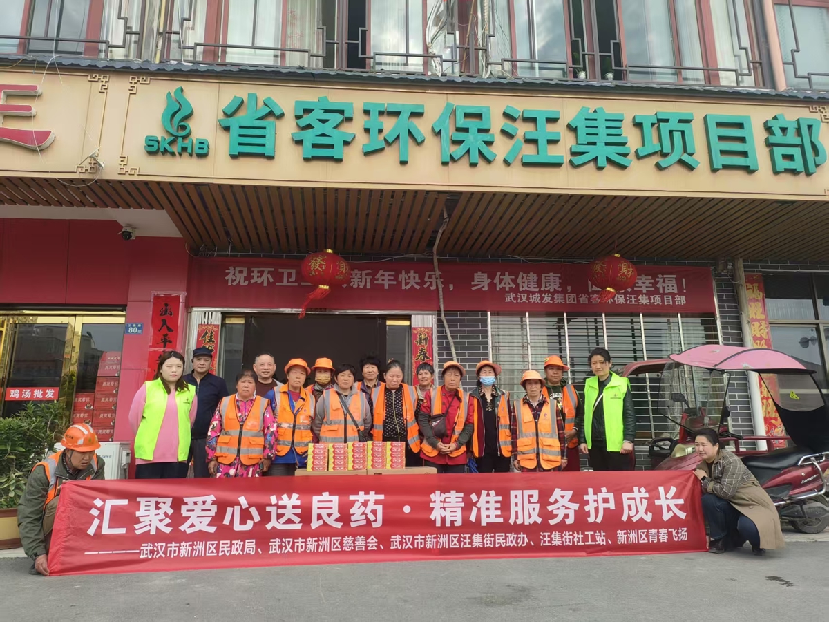 4月2日,在武汉市新洲区省客环保汪集项目部,环卫工人们从汪集街道社工站与青春飞扬慈善机构工作人员手中接过了一批治疗皮肤病的药品,预防春夏季环卫工人常见职业病。
