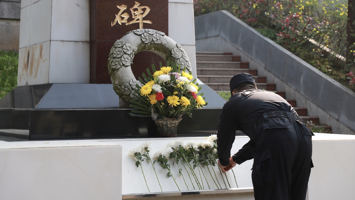 4月2日清早,九峰山烈士陵园松柏凝翠、庄严肃穆,在青山公安因公牺牲民警杨睿的墓前,分局刑侦大队副大队长洪慧鹏带领大队青年党员民警、辅警、入党积极分子代表整齐列队、脱帽静立。