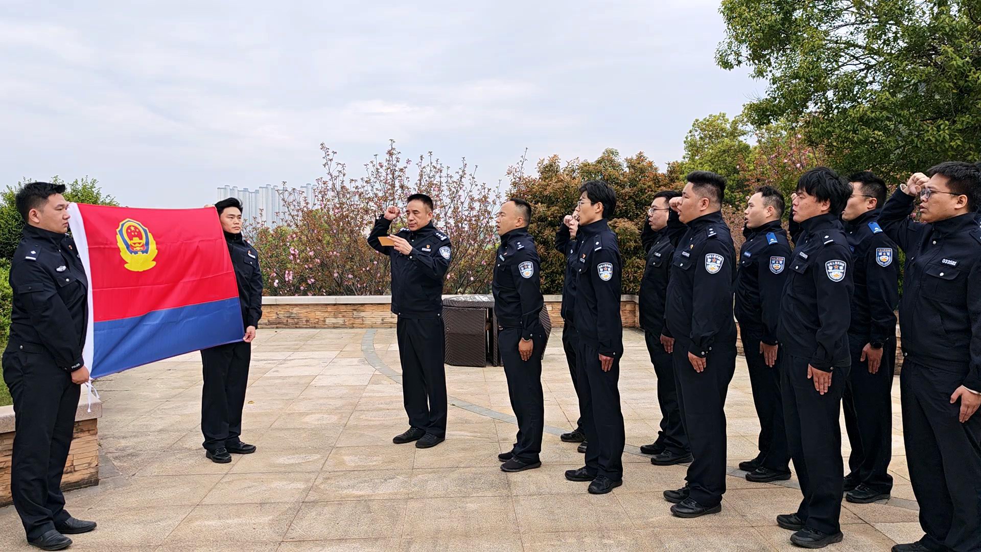 “我志愿成为中华人民共和国人民警察,献身于崇高的人民公安事业……” 讲述毕,王勇高举右拳,以洪亮嗓音庄严领誓,全体青年民警、辅警亦举起右拳,面向墓碑和警旗,齐声重温公安机关人民警察誓词。