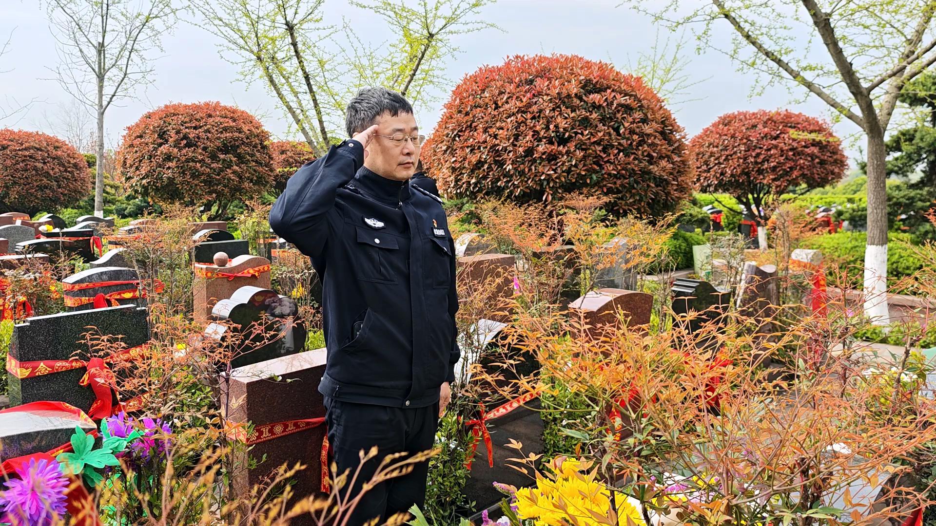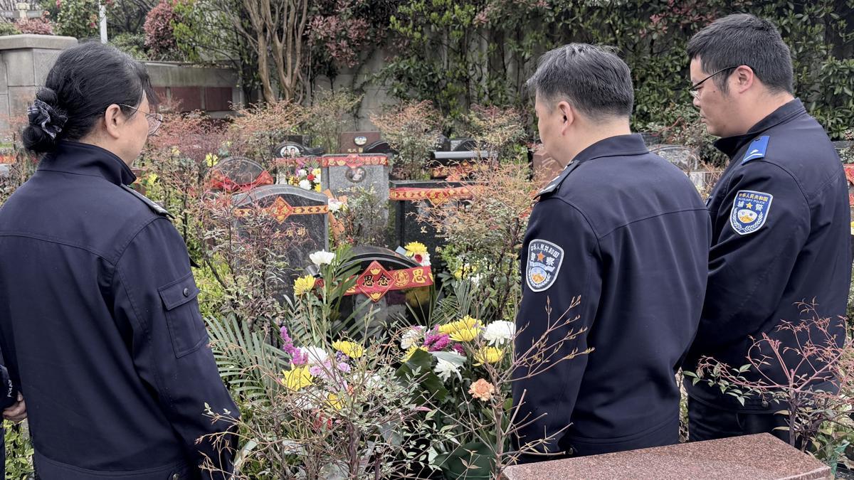 春日的九峰山烈士陵园草木葱茏,静谧庄严。在教导员程进军的带领下,全体民警、辅警代表怀着沉重的心情,来到杨睿——这位曾经的副所长墓前静静伫立。有人轻轻拂去碑前尘土,有人缓缓献上鲜花,用最朴素、庄重的形式缅怀这位用生命守护平安的战友。