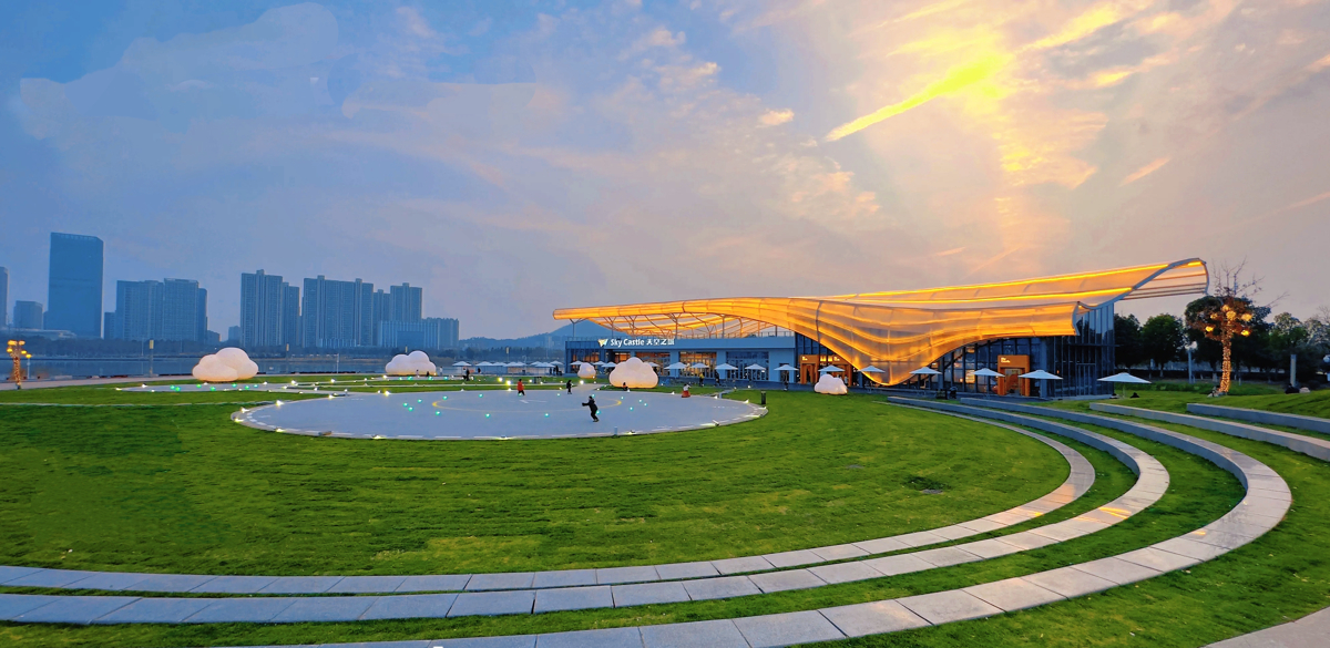 “天空之城”项目位于文化大道中央大公园园区内,由武汉市江夏文化旅游发展集团有限公司承建,于2025年12月启动,今年3月全面完工。项目最大的亮点在于景观灯设计——摒弃传统静态照明,创新采用“呼吸式灯光秀”,外立面覆盖半透明膜结构屋顶,通过流动的曲线线条与灯光亮化联动,整体呈现出动态漂浮的“飞行魔毯”意象,轻盈通透。从高空俯瞰,半透明的漂浮屋面宛如公园中的一盏明灯、一只透亮的灯笼,更似一颗“轻盈跳动的心脏”——既是公园里的城市灯塔,又有节奏地“呼吸跳动”;户外道路灯光则如一条彩带,将整体结构与城市有机相连。