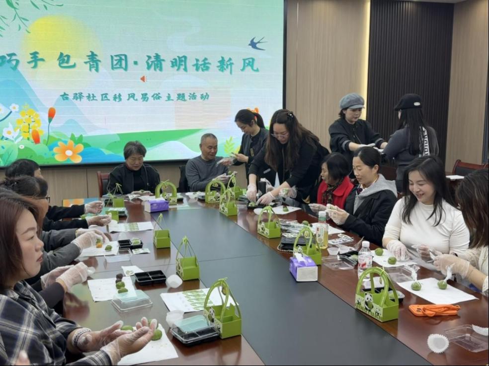 古驿社区举办“巧手包青团,清明话新风”活动,居民围坐协作揉面、包馅,在传统美食制作中感受春日气息,同步发起文明祭祀倡议,共话绿色平安清明。育才社区以清明读书会为载体,组织居民诵读清明诗词、红色家书与家风家训,搭配植物拓印等非遗手工,在动手创作中感受传统文化与非遗魅力。