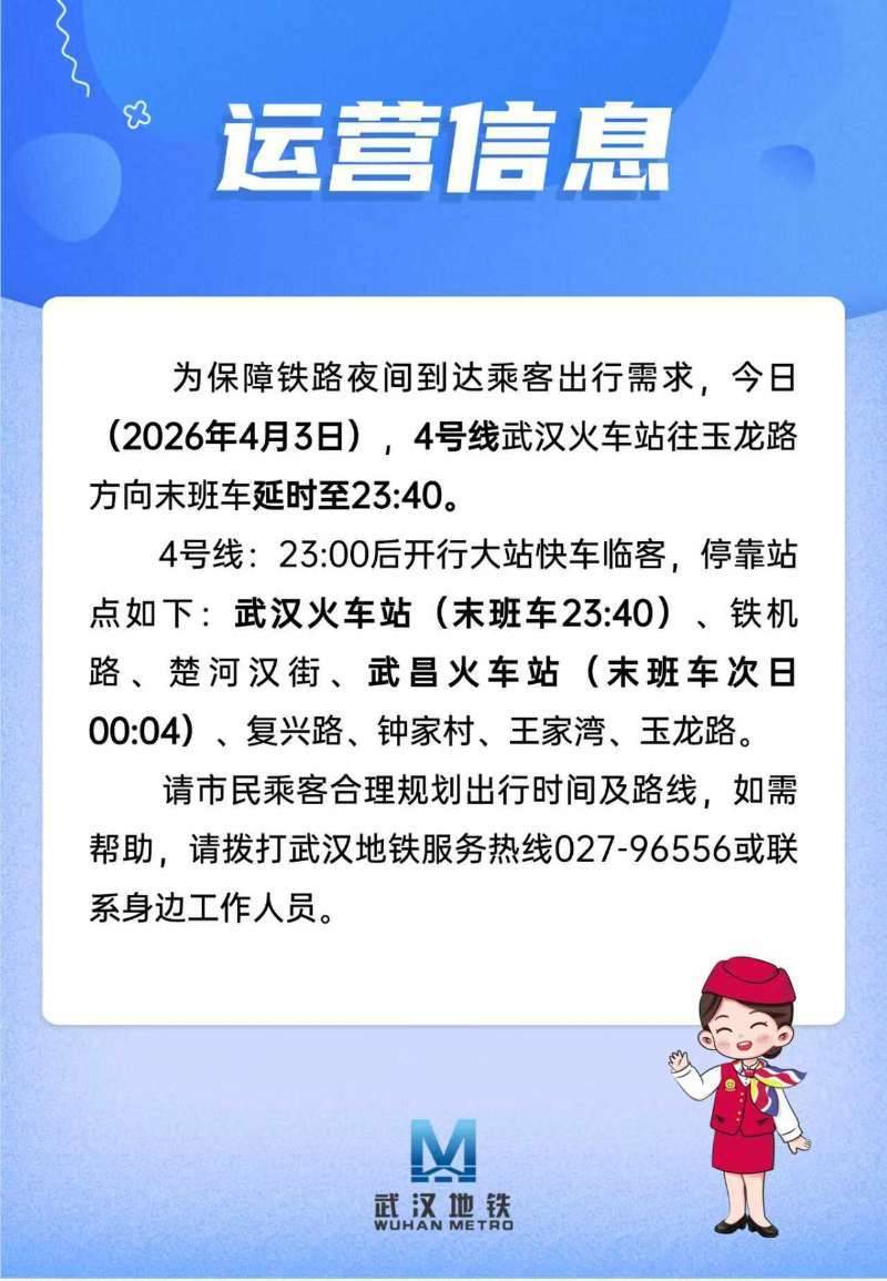 湖北日报讯(记者杨千帆、通讯员李丹、产启斗)为保障铁路夜间到达乘客出行需求,今日(2026年4月3日),4号线武汉火车站往玉龙路方向末班车延时至23:40。