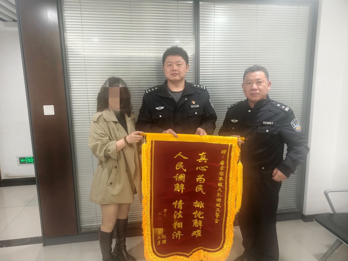 4月3日上午,市民朱女士专程来到武汉市公安局江汉区分局交通管理大队事故中队,将一面印着 “真心为民,排忧解难”“人民调解 情法相济” 的锦旗送到中队民警谢斌兵手中,对其公正高效处置交通事故、用心化解矛盾纠纷的工作表示诚挚感谢。