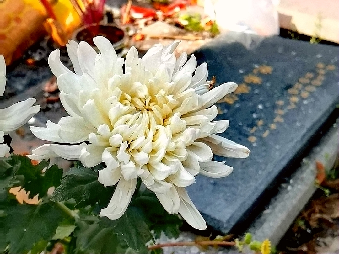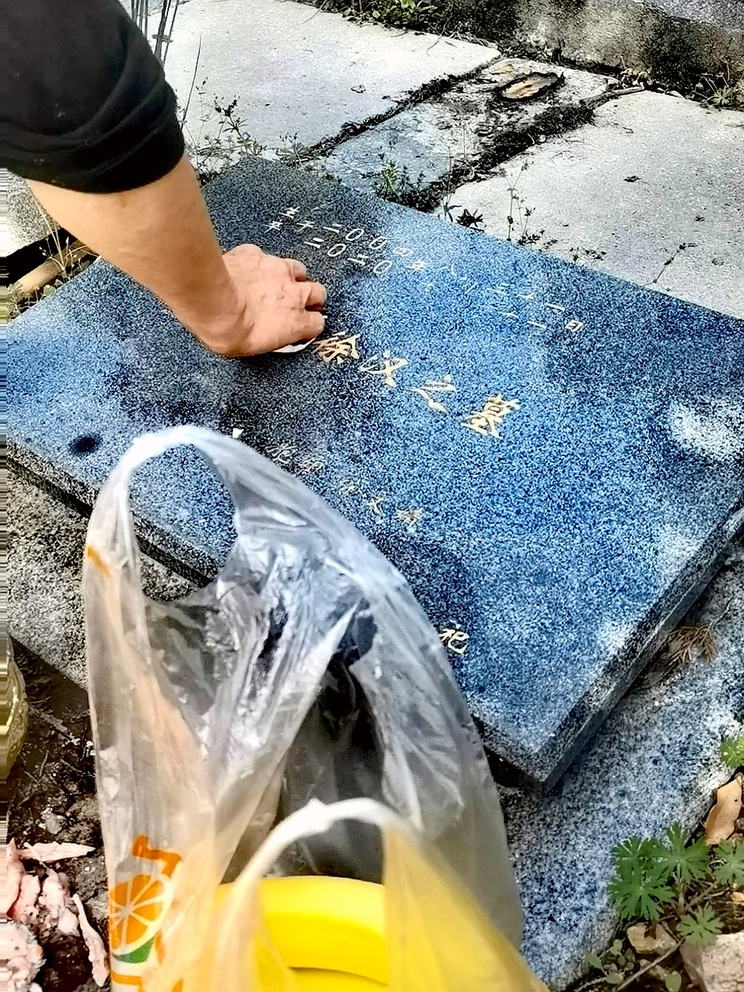 徐朋蹲在墓碑前,轻柔地将菊花插在墓碑两侧的泥土里,打开塑料袋,将儿子生前喜欢吃的香蕉、芒果、八宝粥等食物拿出来摆好。拂过石碑上的尘土,触摸着儿子的名字,徐朋声音中带有一丝歉意,因为这次没有来得及去买儿子最喜欢吃的汉堡包。