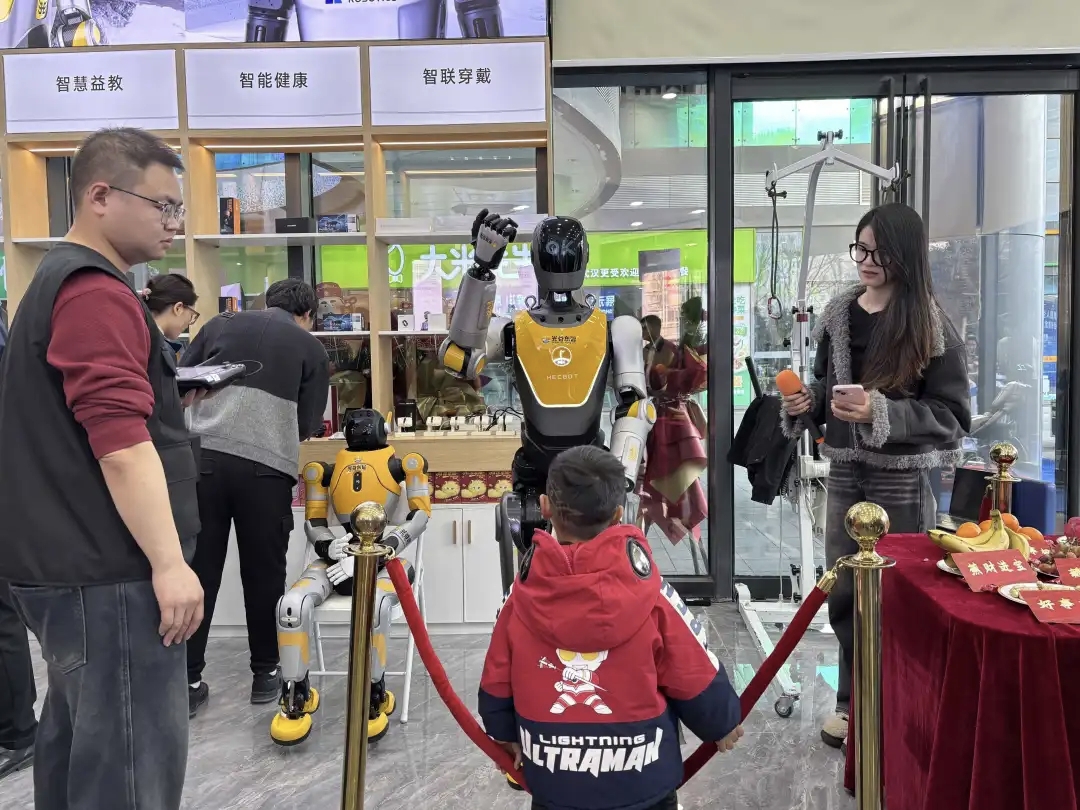 走进旗舰店,仿佛踏入“未来生活体验馆”:机器人乐队默契演奏,“熊猫花花”绒毛玩具主动问候,机器狗热舞卖萌,还有能定制旅游攻略的武汉文旅数字人推荐官……