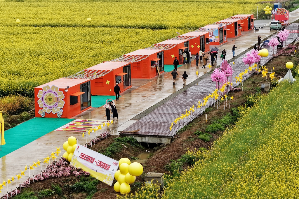基地相关负责人介绍,花海区域同步配套了多元化休闲设施,着力提升游客体验。新建的360°全景观景台,可将整片花海尽收眼底,风车长廊、地面彩绘、秋千等趣味互动装置错落分布,轻松满足亲子遛娃、情侣约会等不同需求。此外,集装箱摊位与乡村市集同步上线,特色小吃、文创好物一应俱全,让人们在赏花之余,也能感受到浓浓的乡村烟火气。