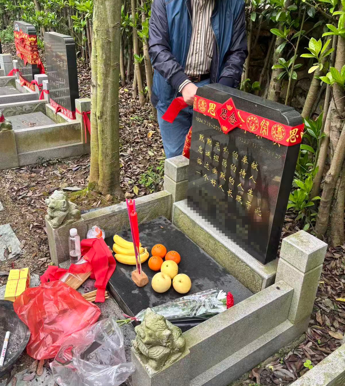 72岁的朱宝德背着布包,缓缓走到这座墓碑前,先放下装有香蕉、苹果、橘子的祭品袋,再俯身仔细整理好祭品。