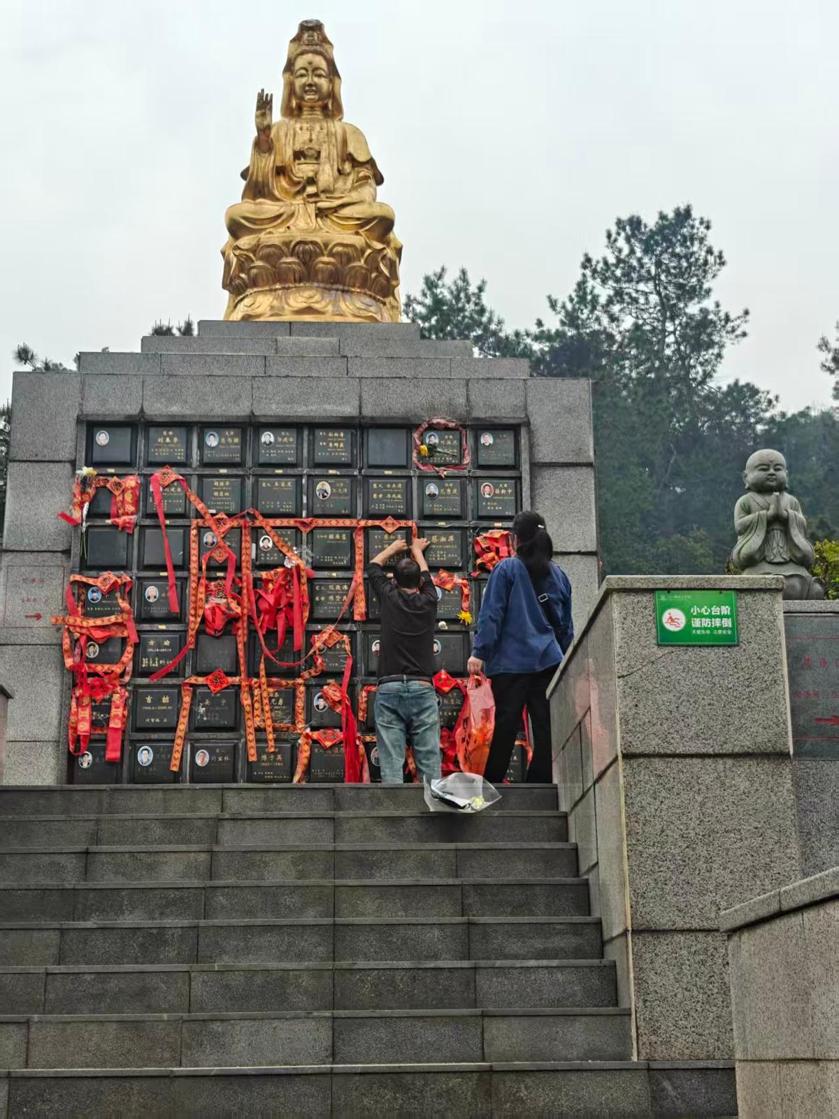 沿着石阶缓缓而上,蔡先生夫妇在一尊金身观世音菩萨像前停下了脚步,目光虔诚而温柔。蔡先生的父母和姐姐,就安葬在圣像下方的壁挂式墓区。“我信佛,当初就是看中这里有观音像,觉得亲人能在菩萨的护佑下安息,心里踏实。”蔡先生语气中满是虔诚。
