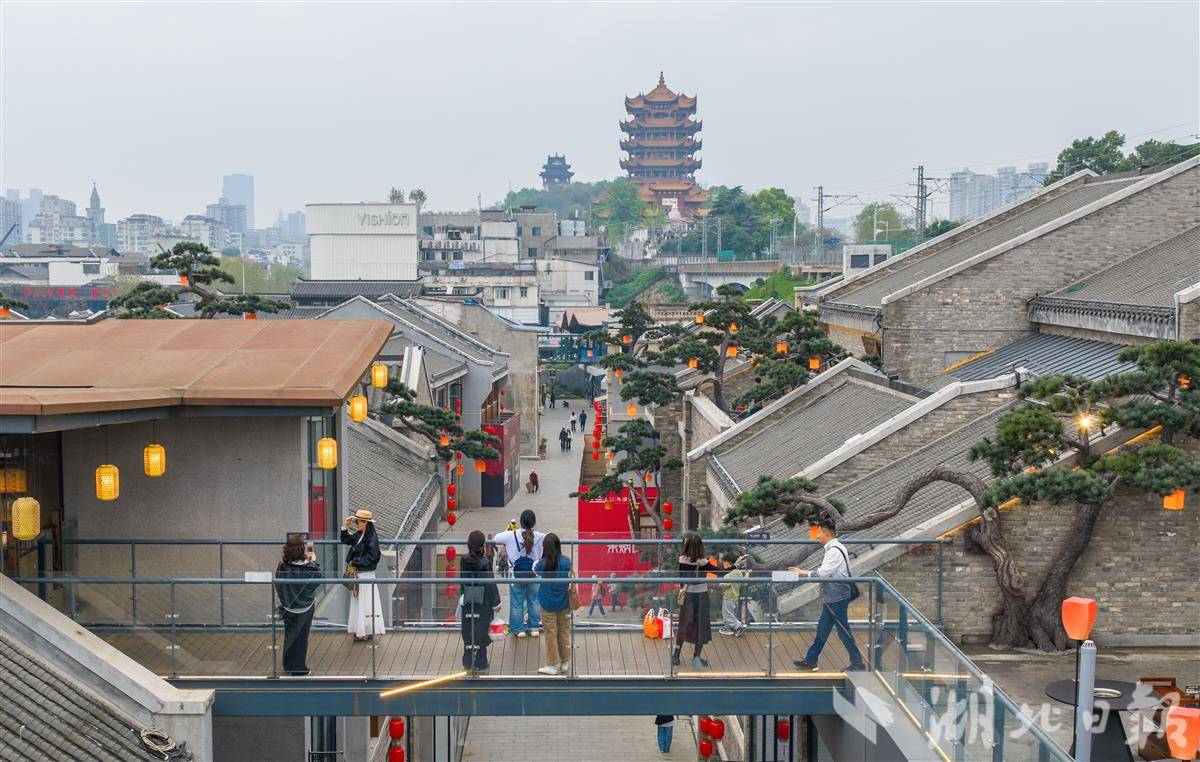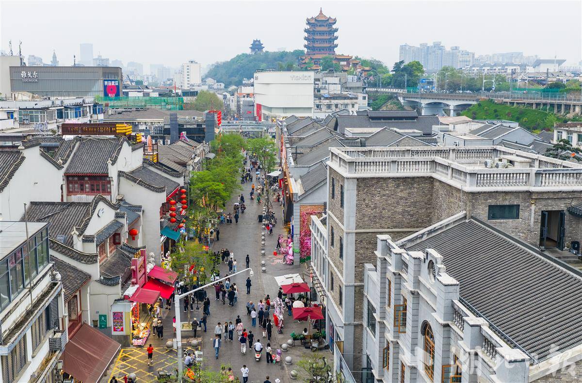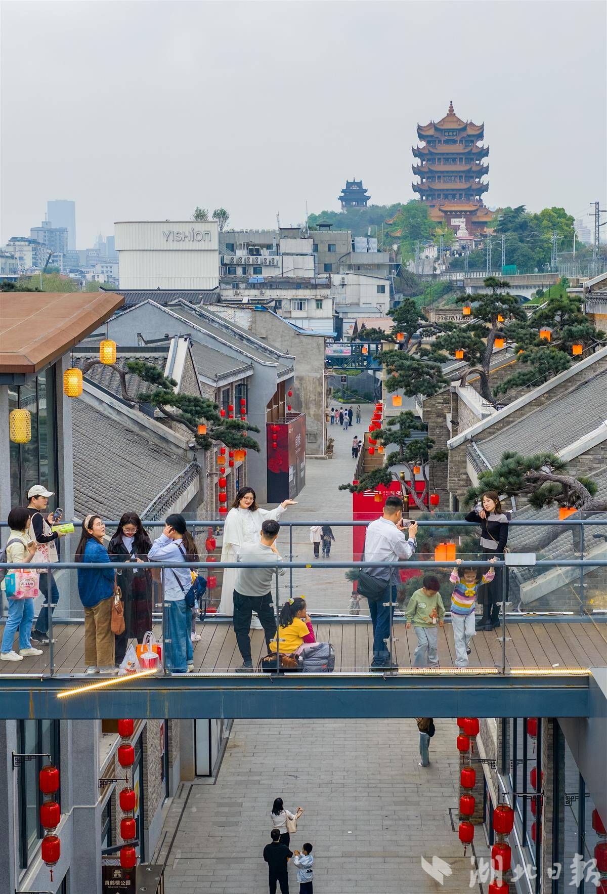 4月6日,武汉武昌古城斗级营街区,游人络绎不绝,与远处的黄鹤楼相映成景。