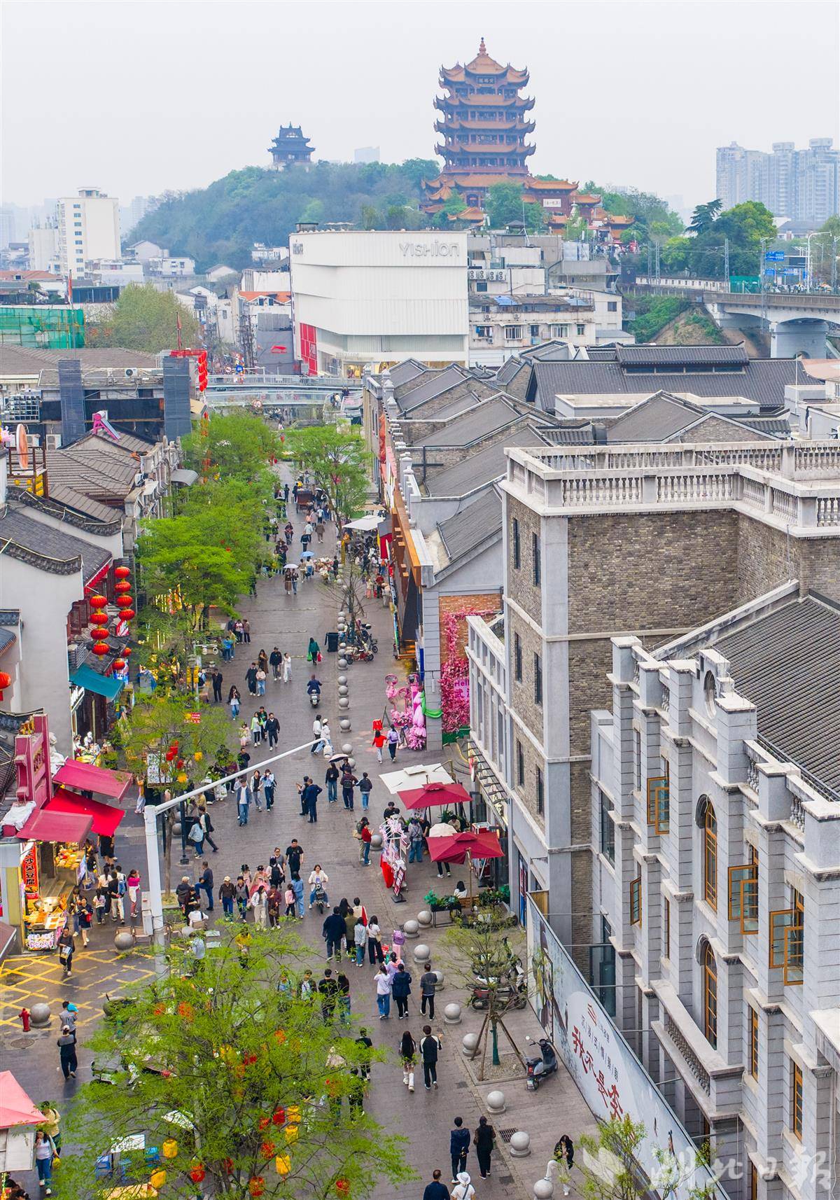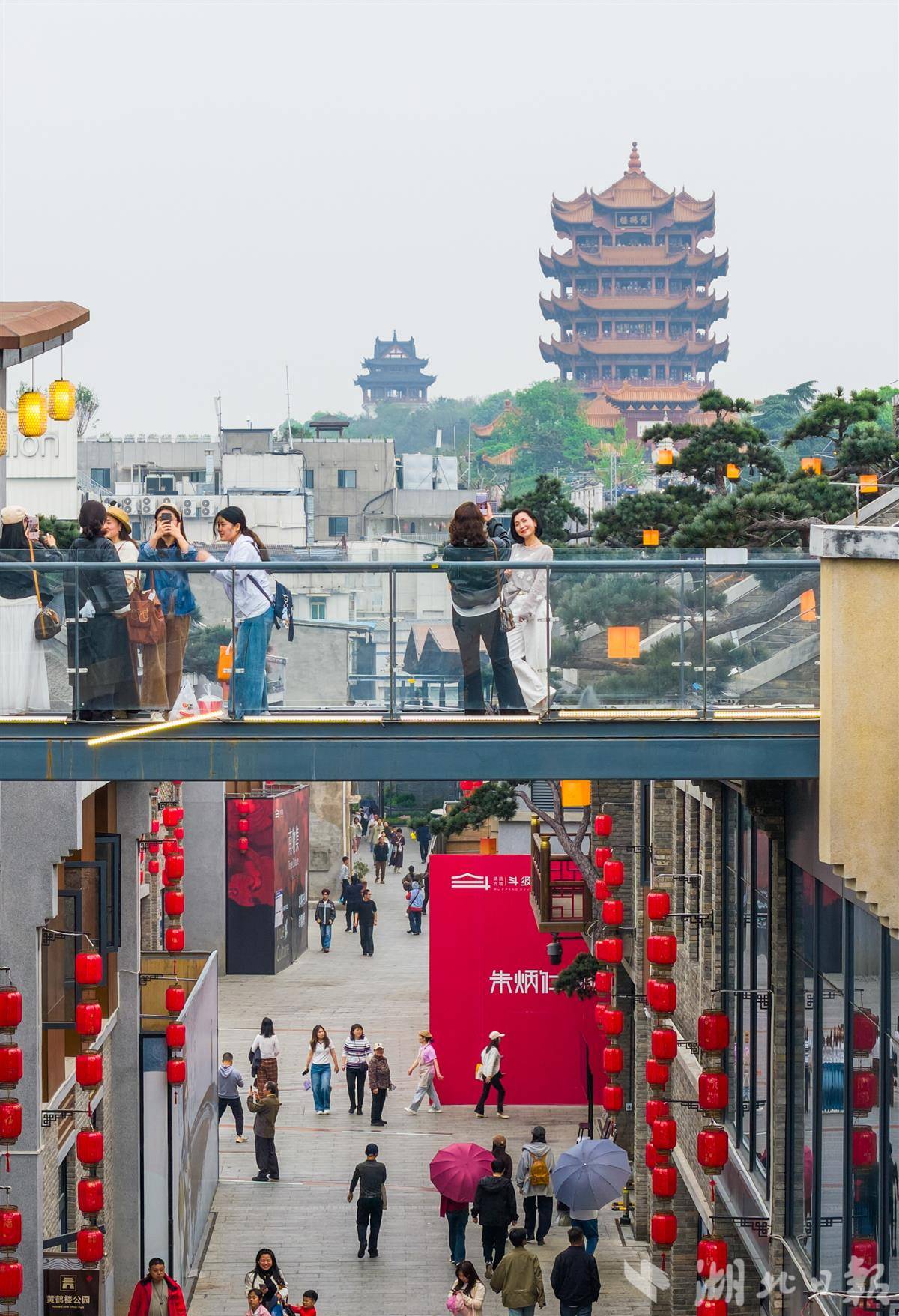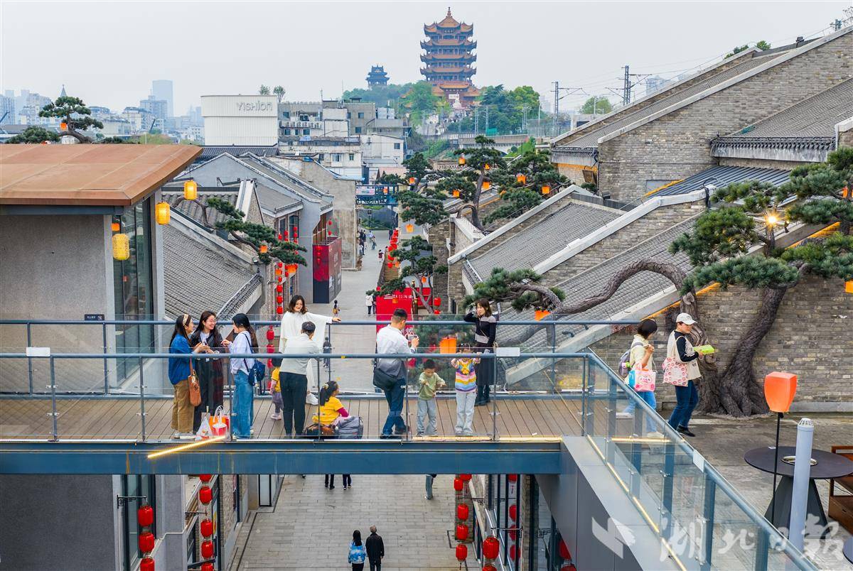 4月6日,武汉武昌古城斗级营街区,游人络绎不绝,与远处的黄鹤楼相映成景。