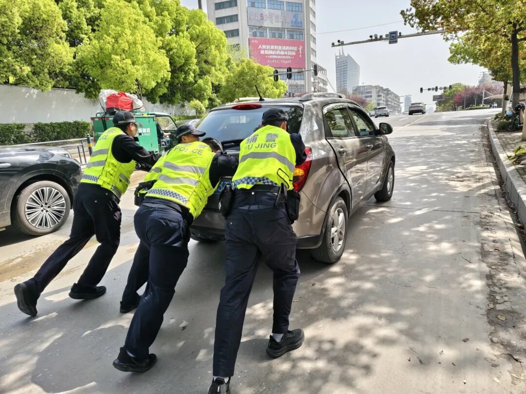 鄂州交警帮助驾驶人将抛锚车辆推至安全地带