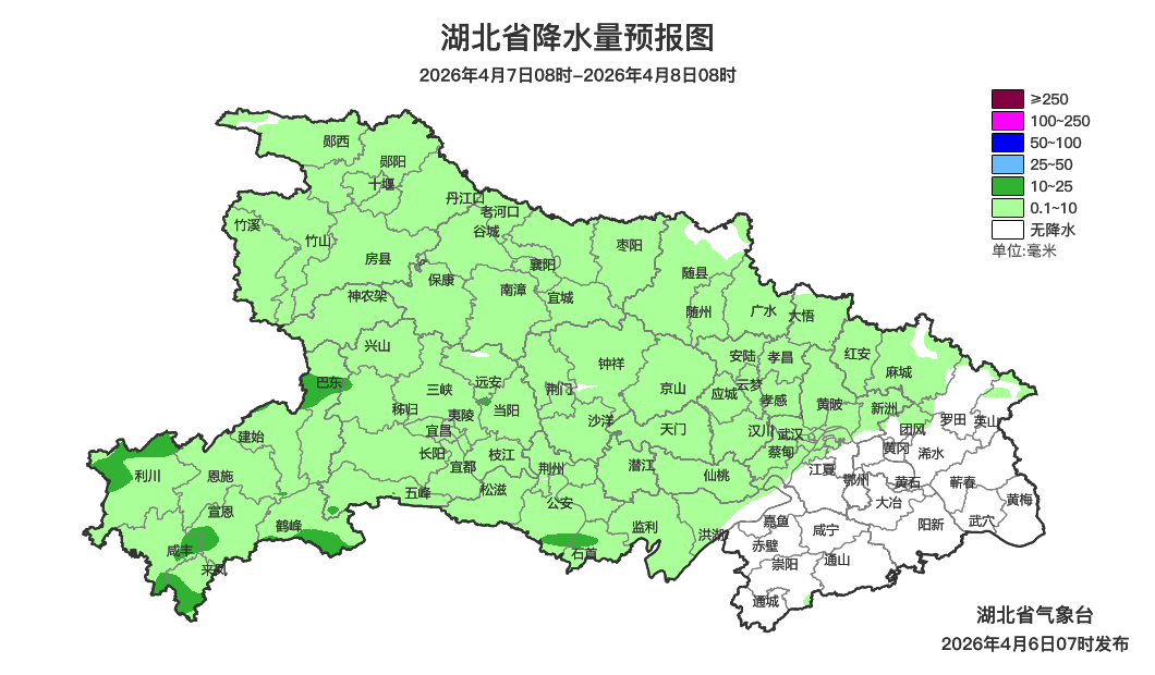 4月7日08时-8日08时:鄂西北南部、鄂西南、江汉平原西部阴天有小雨,局地中雨;鄂东南多云到阴天;其他地区多云转小雨。南部局地伴有雷电。最高气温20~25℃,最低气温13~17℃,偏北风转偏东风3级、阵风4到6级。