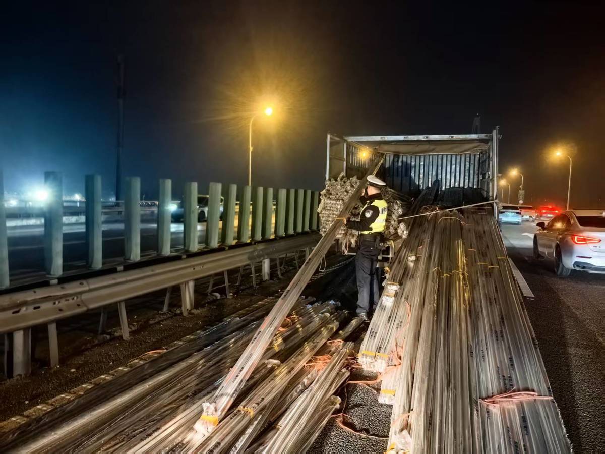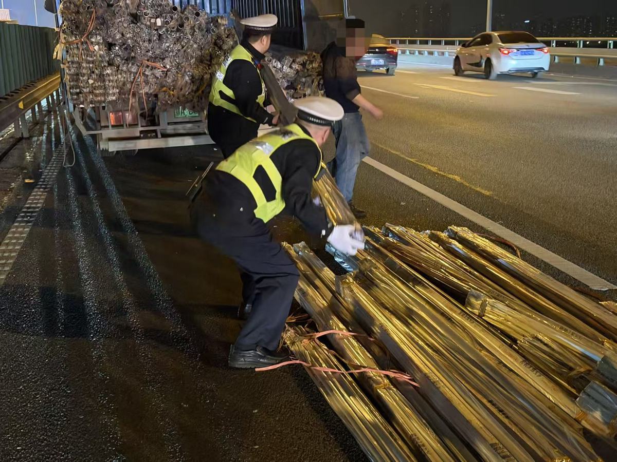 警情就是命令。汉阳区公安分局交管大队指挥室接警后,立即调派警力赶赴现场。二中队指导员孙涛带领民警曾诚、辅警队长张欣迅速抵达现场。三人分工明确,一边设置警戒区域、疏导积压车流,严防二次事故发生;一边化身“搬运工”,与司机合力将散落的钢管一根根搬回车厢,并重新捆扎牢固。经过一个多小时的紧张奋战,所有钢管均被稳妥固定,道路恢复畅通。