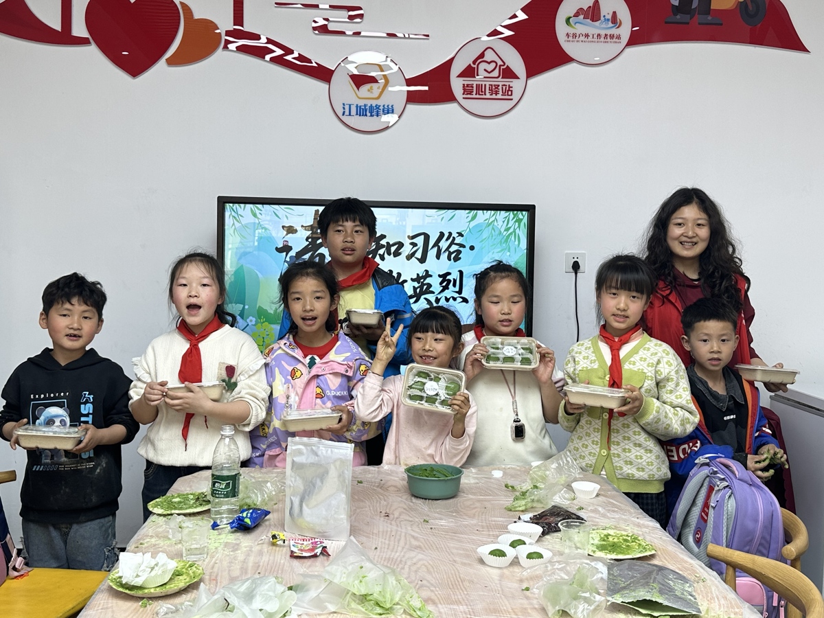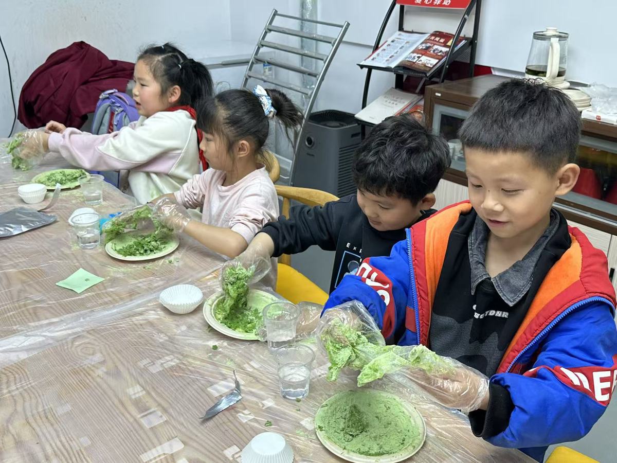 最让孩子们期待的,莫过于清明美食汇环节。屏幕上播放着青团科普短片,社工细致讲解着青团的由来与民俗寓意,手把手示范揉面、包馅、定型的每一个步骤。孩子们跃跃欲试,在工作人员的贴心协助下,小手翻飞间,揉面团、填馅料、搓圆成型,活动室里满是艾草的清香和孩子们的欢声笑语。一个个圆润饱满、色泽鲜绿的青团顺利完成,孩子们捧着亲手制作的成品互相展示,眉眼间满是成就感,在实践中真切触摸到了清明民俗的温度。