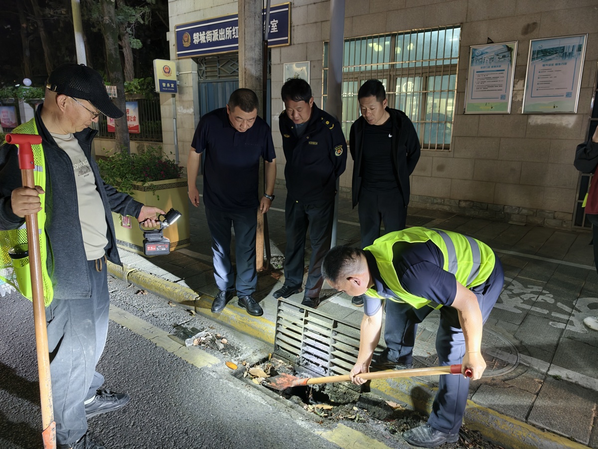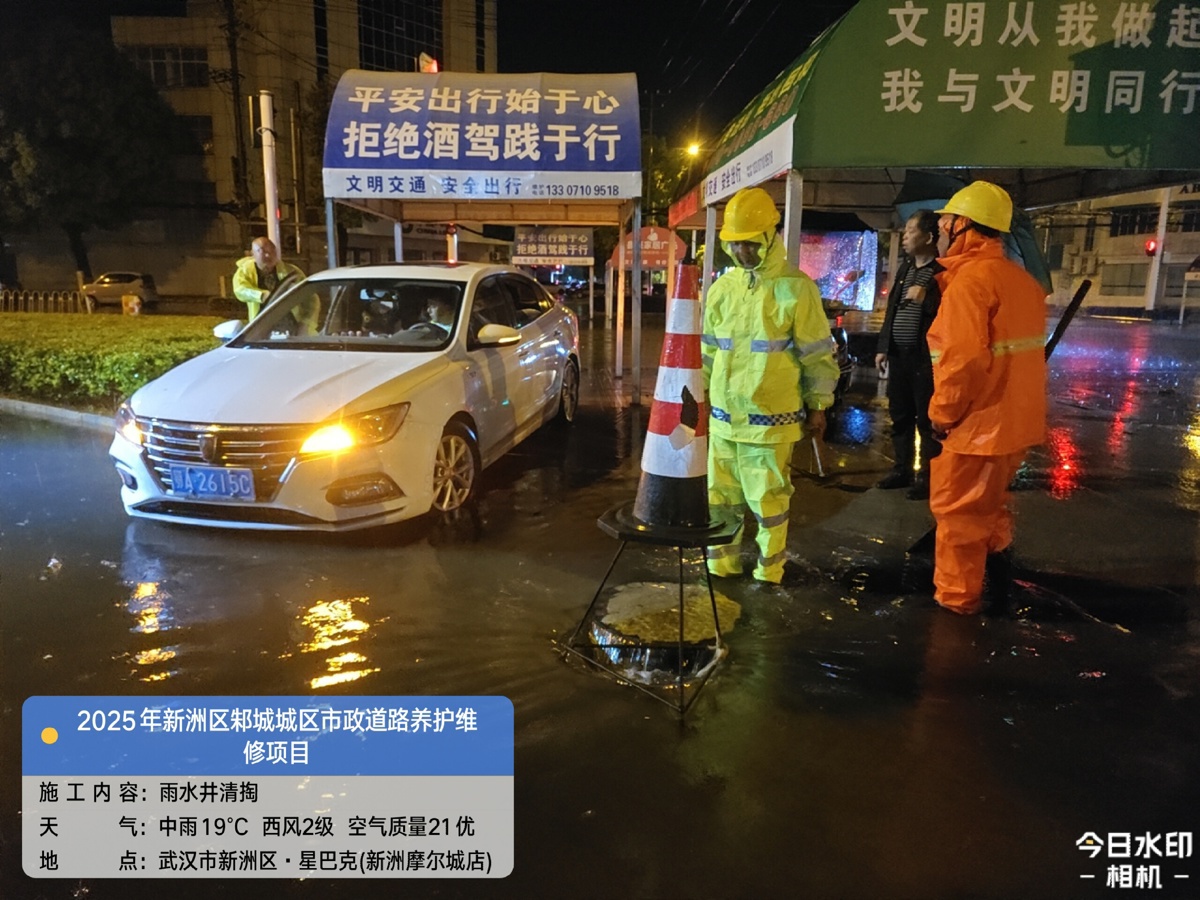 凌晨1时许,新洲区城管执法局局长王振兴带队对齐安大道、龙腾大道、新洲大街、文昌大道等重点点位进行巡查,现场组织积水抽排作业,协调水务部门联动处置。