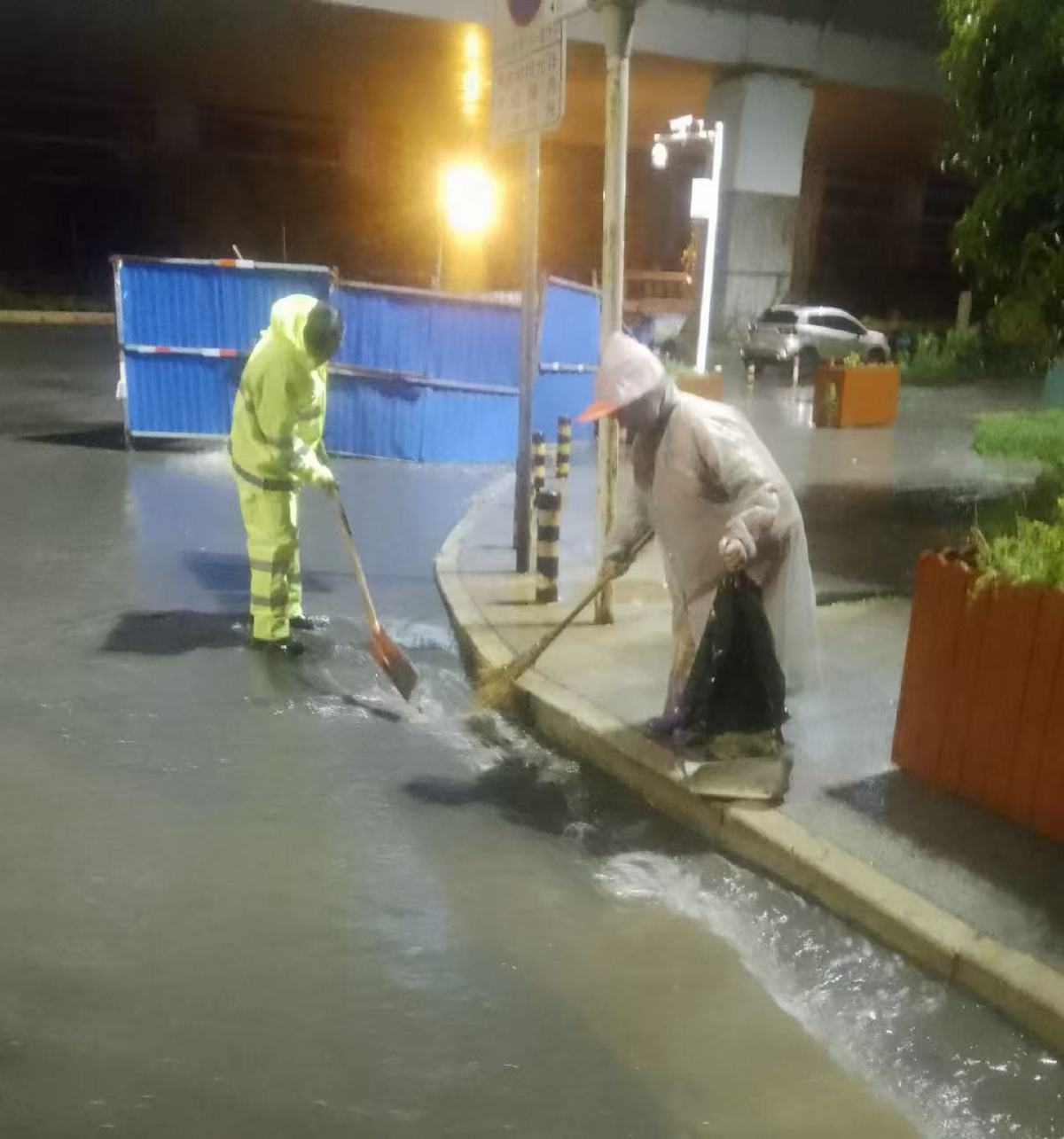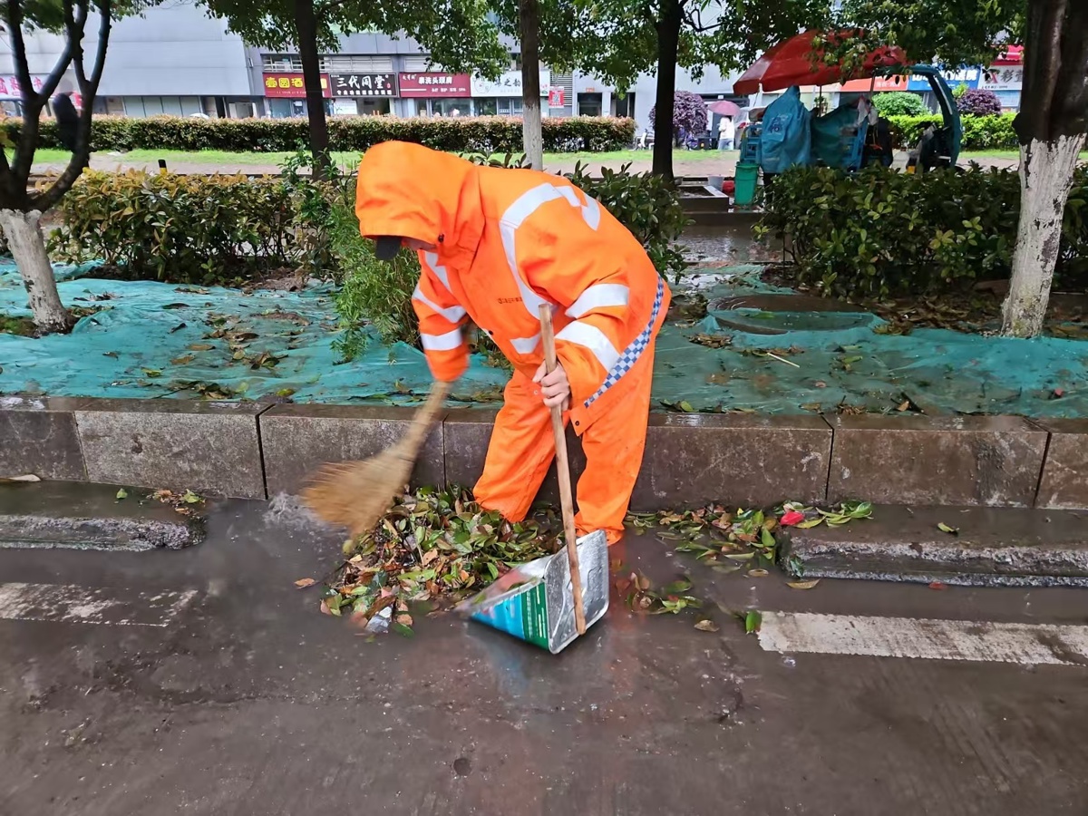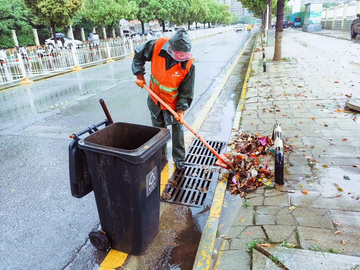 巡查中,环卫工人顶风冒雨,快速清掏被垃圾、落叶堵塞的排水口,及时消除因杂物淤积引发的排水梗阻,有效避免了局部内涝的发生。